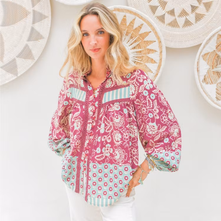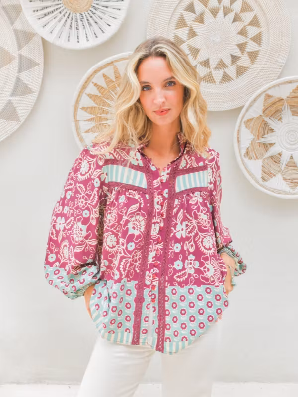 Boho-blusen kommer från australienska Jaase. Den har en avslappnad passform med knappar längst hela framsidan och broderade detaljer som löper parallellt med knapparna på vardera sida. Ärmarna är av ballong-modell och dras ihop i ärmslutet för en fin detalj. Ett drömplagg i vibrerande rosa och lugnande blå botten med blommor och ränder i mönstret. Styla med byxor av vitt eller blått denimtyg, en skir kjol eller shorts under varmare dagar. Passar utmärkt till en kofta för kyligare dagar för en mysiga look eller exempelvis en skinnjacka för en tuffare stil.
