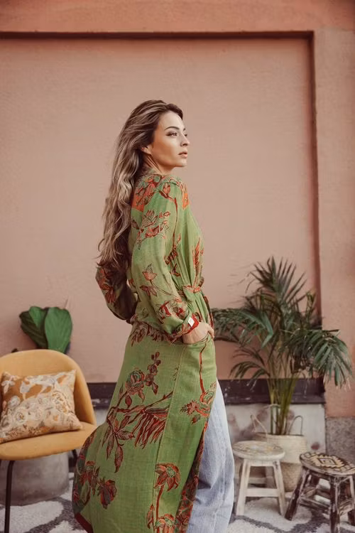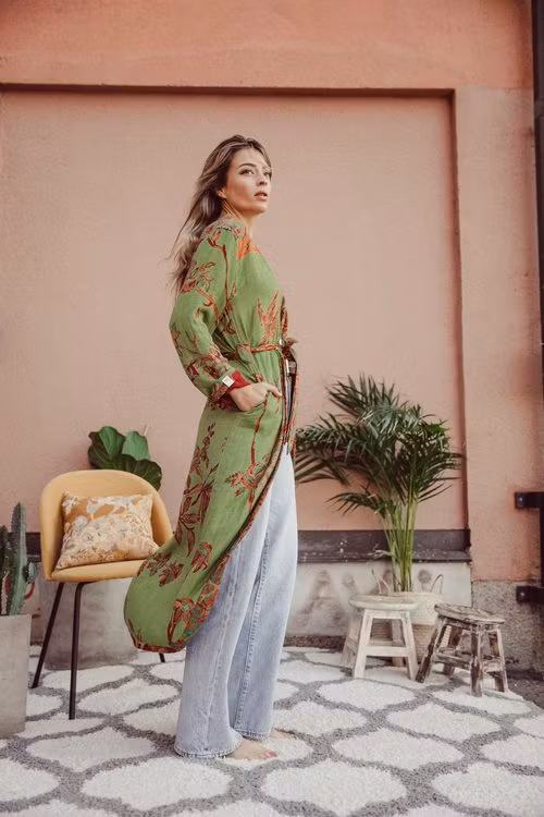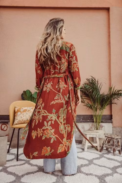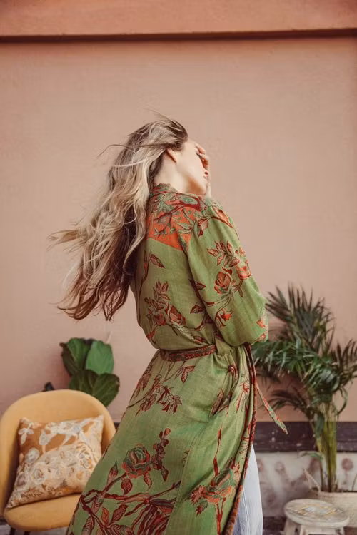 Brahmakis signaturkimono är den ultimata blandningen av ledigt och lyxigt - den är också vändbar! Ena dagen vill ha ha en ljusare kimono med mycket färg, men nästa kanske mer sober. Lika välsydd för hand på båda sidorna. Verkligen användbar.