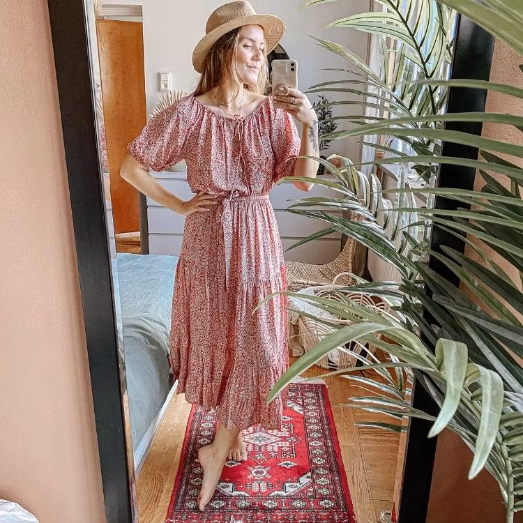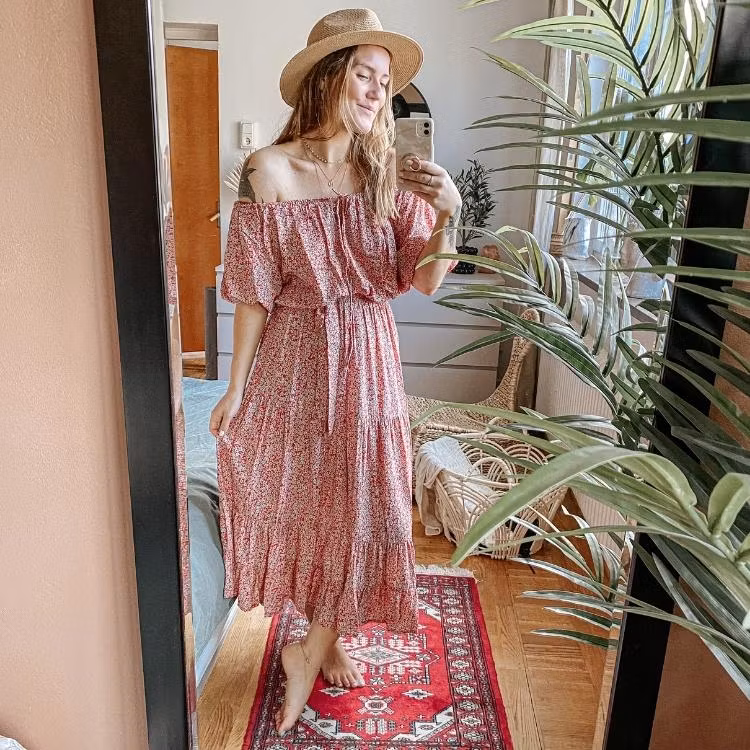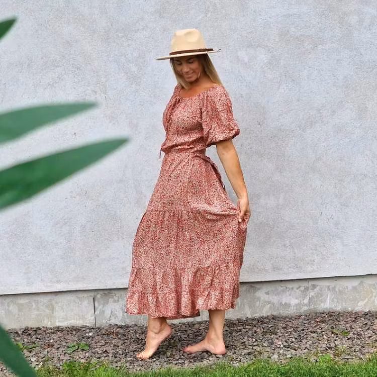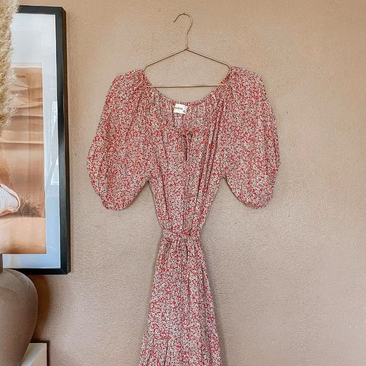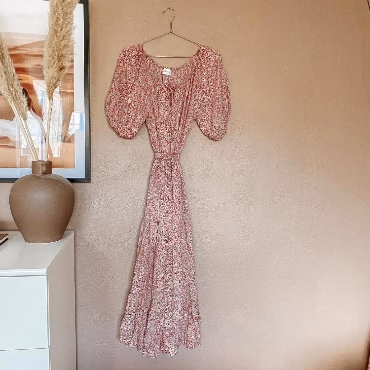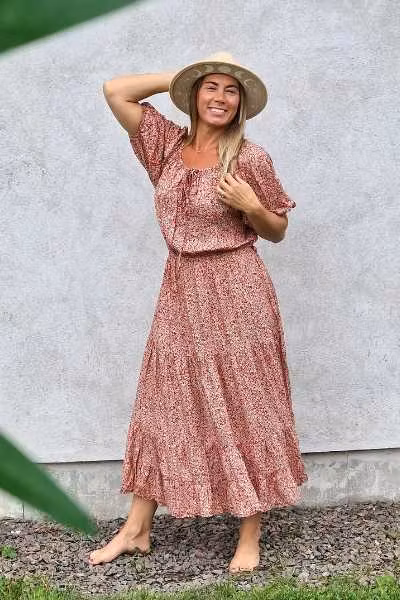 Vacker romantisk klänning från märket daydrm. I snygg bohemisk stil med många, unika detaljer. Klänningen har kortare ärmar med böljande tyg som faller vackert på kroppen. Denna vackra klänning med feminine look passar till flera olika tillfällen, både till vardags, fest såsom till stranden under varma sommardagar. Snörning upptill där du kan välja om du vill ha klänningen "over shoulder" eller knyten om du hellre vill ha en sötare look. Gummiband upptill och på ärmarna. Midjan delas av med ett skärp av samma tyg som klänningen.