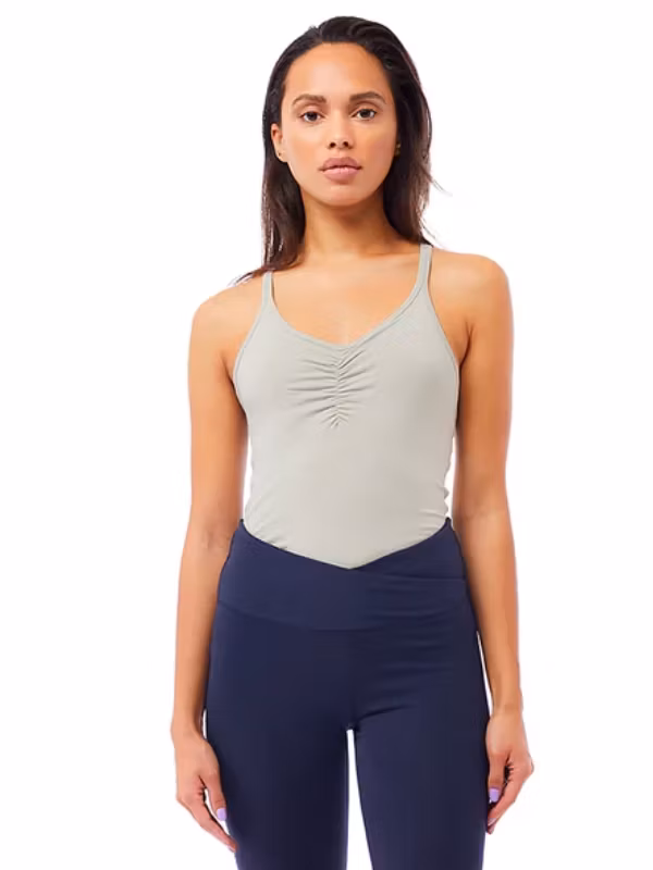 Underbar yoga topp i ekologisk bomull med fina detaljer. Ett riktigt snygg linne med skön passform. Rynkor mellan bysten som en vacker och feminin detalj. Korsade tunna band i ryggen ger ett fint mönster. Inbyggd bh vaddering (avtagbar) som håller brösten på plats under aktiva yogaövningar. Mjuk och skön känsla mot huden som gör det till en topp man vill bära utanför yogamattan.