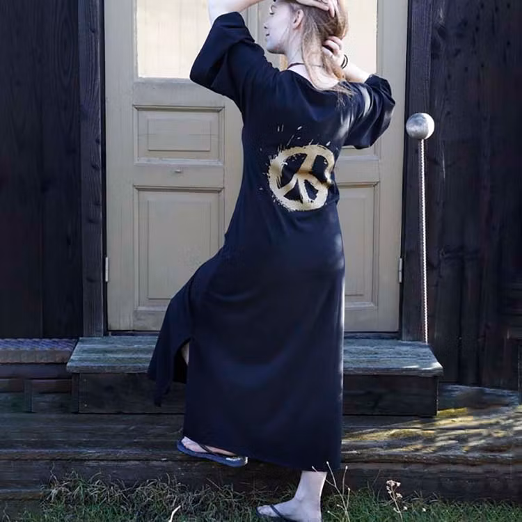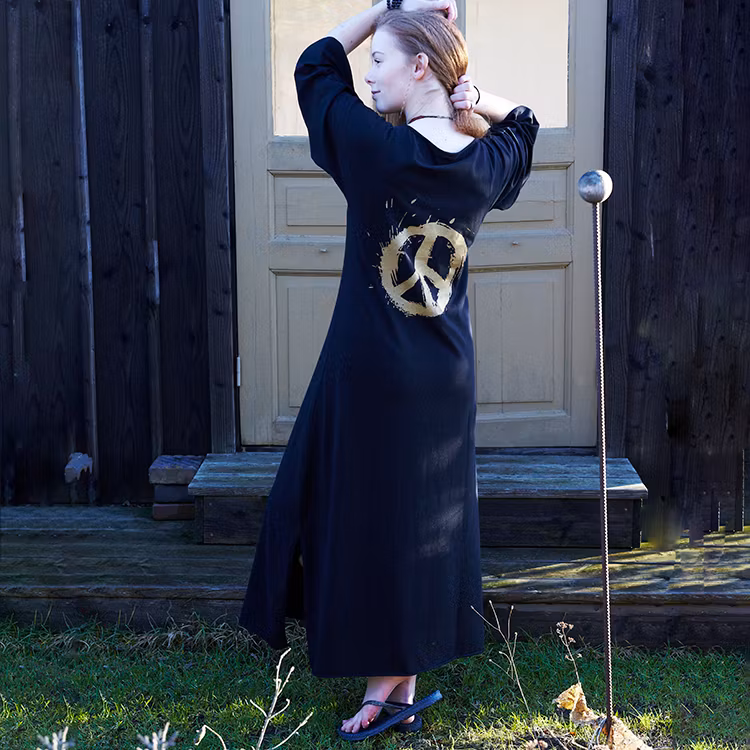 Var vacker och bekväm i denna superhärliga klänning från Santa Ni. På ryggen är det ett snyggt peace märke tryckt i guld som ger klänningen lite extra känsla.