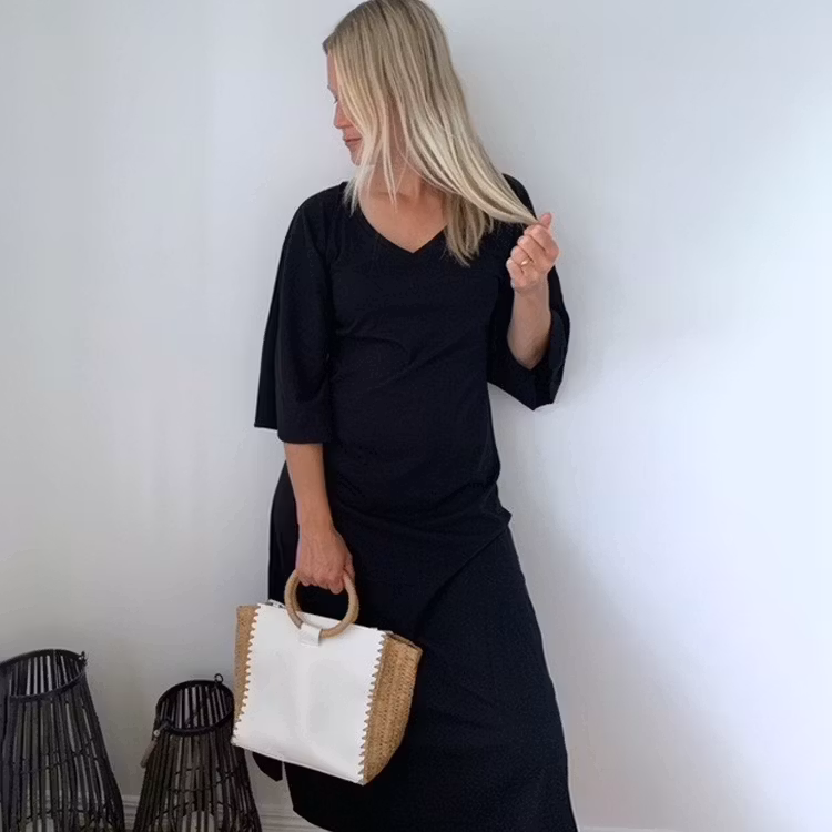 Klänningen har en V-ringad hals och en vid 3/4 ärm. Bra miljöval då den är tillverkad i svenskvävd ekologisk bomull. Lätt och luftigt mot kroppen.