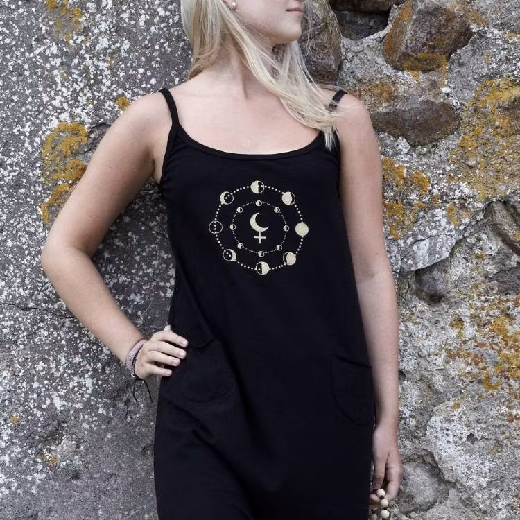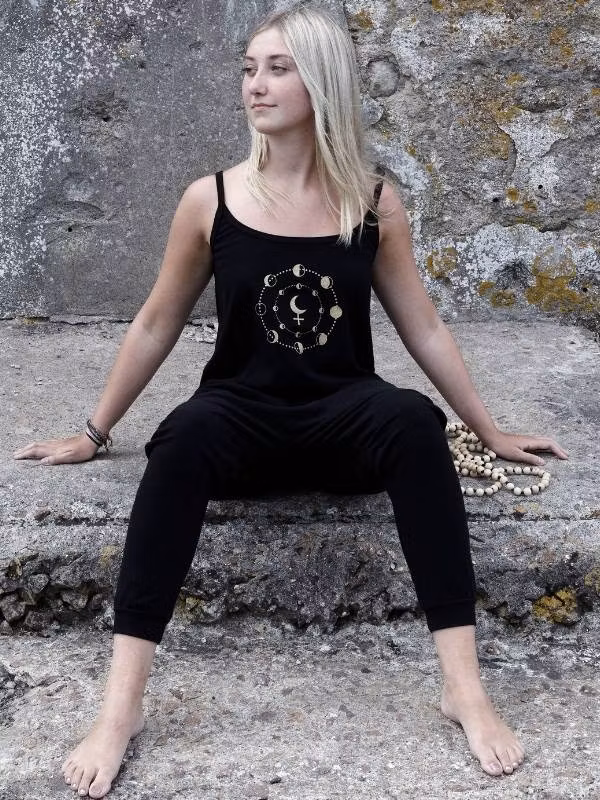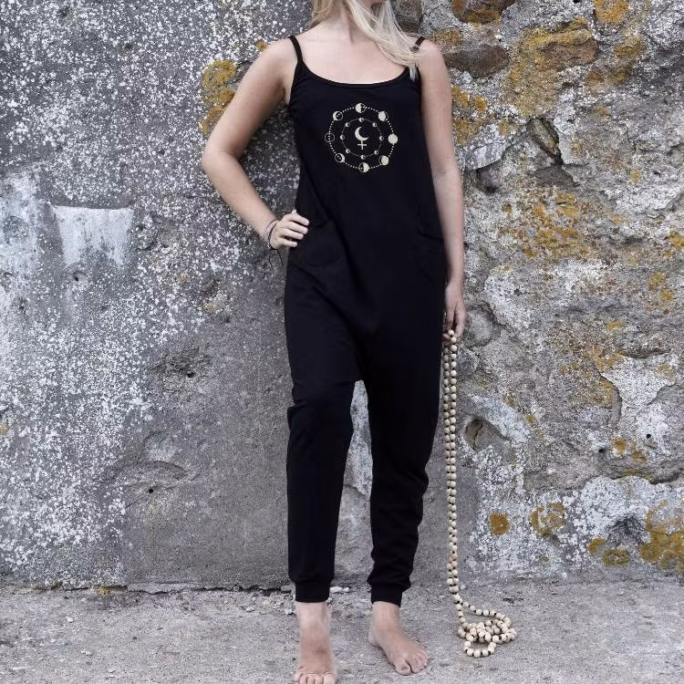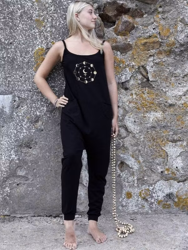 Otroligt snygg och bekväm jumpsuit från Santa Ni. Denna modell har en lösare passform med tunna axelband med ett vackert tryck i guld på månens olika faser.