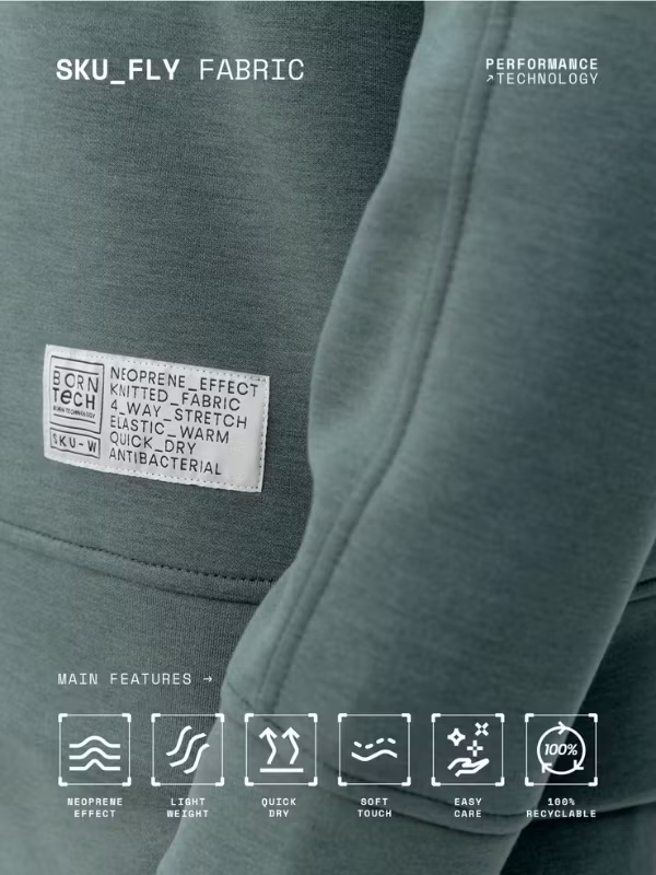 Materialet har 4-vägsstretch som följer kroppens rörelser utan att begränsa, samtidigt som det känns mjukt och behagligt mot huden. Den dubbelstickade konstruktionen ger en lätt strukturerad känsla med inslag av neopren – slitstark, skrynkelfri och bekväm i alla lägen.