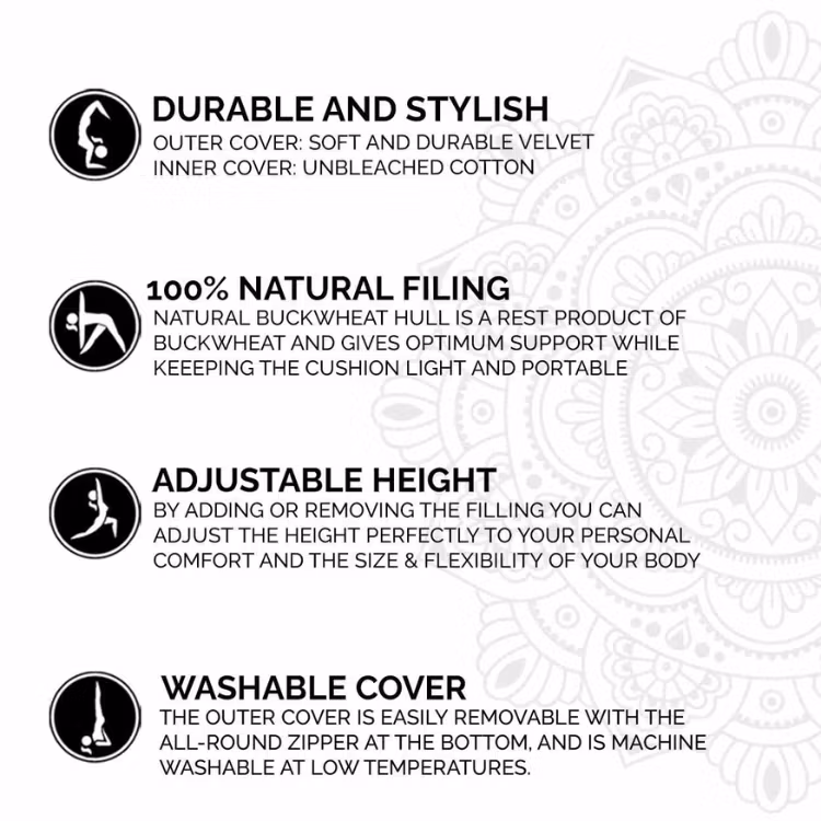 Meditationskudden är tillverkad i slitstarkt och mjukt sammetstyg med ett brett bärhandtag på sidan. Praktisk dragkedja som går hela vägen runt på undersidan av kudden vilket gör den mycket enkel att öppna om du t.ex vill ta ut hela innerkudden för att tvätta det yttre fodralet. Även innerkudden har en dragkedja så du lätt kan justera mängden boveteskal så det passar just din kropp.