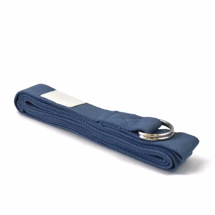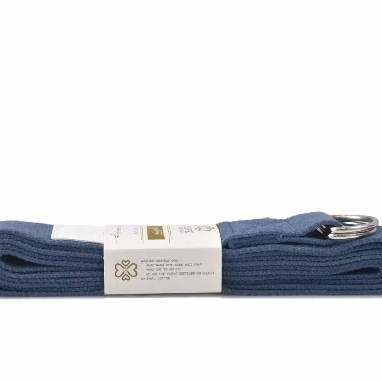 Havsblått Yogabälte i bomull från Love Generation. Ett bälte är ett mycket bra tillbehör som du kan använda ofta i din yogaträning. T ex när du sitter rakt upp och böjer dig över benen för att nå tårna. Istället för att börja på ryggen, så använd yogabandet och ta det runt fötterna och dra dig framåt.