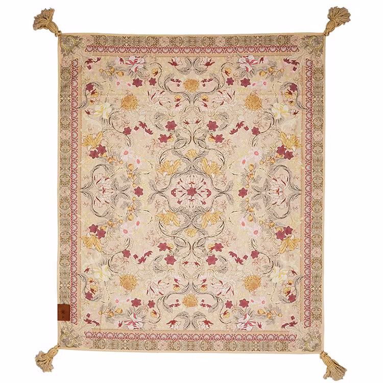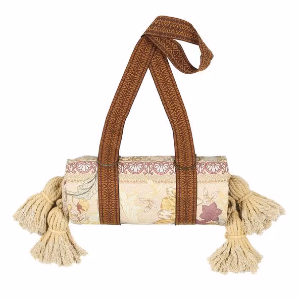 Hörnorna pryds av tjocka härliga tofsar som ger en underbar boho känsla. Till varje filt ingår en vävd bärrem av bomull så att du lätt kan rulla ihop och bära med dig din favorit filt. Dessa små konstverk vill man inte gömma undan utan hänger vackert över axeln när du är ute och lever livet. Filten består av två lager bomull som är behandlade med upf50+ som skyddar mot solen strålar och behåller trycket intakt och levande längre. Undersidan är gjord av en vattentät duk som skyddar mot fukt och smuts och är lätt att torka av.
