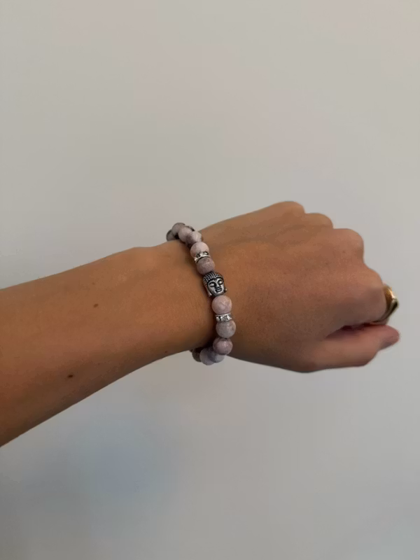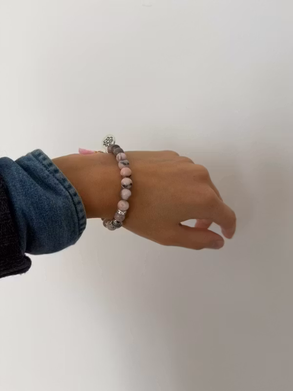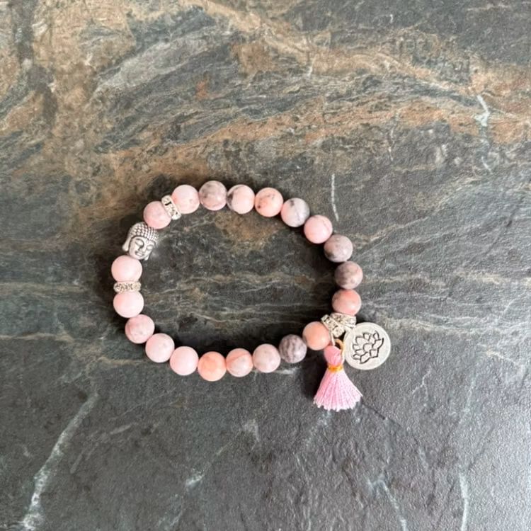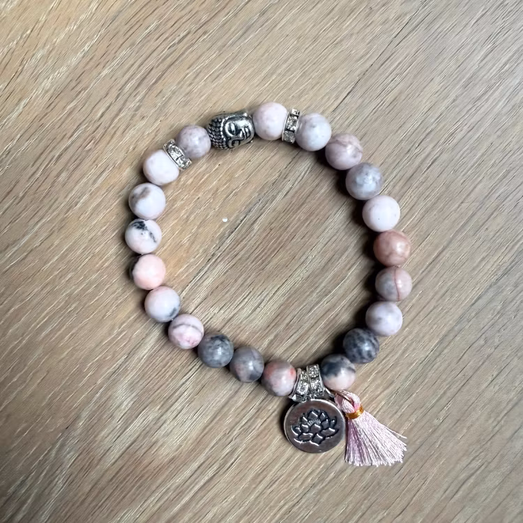 Detta vackra armband är skapat av Pink Zebra Jasper, en sten som förmedlar trygghet, balans och hjärthelande energi. Med en liten Buddha-berlock, en rosa tofs, en silverfärgad lotusplatta och subtila strassdetaljer blir armbandet både ett spirituellt smycke och en elegant accessoar. Det elastiska bandet gör att det passar de flesta handleder.