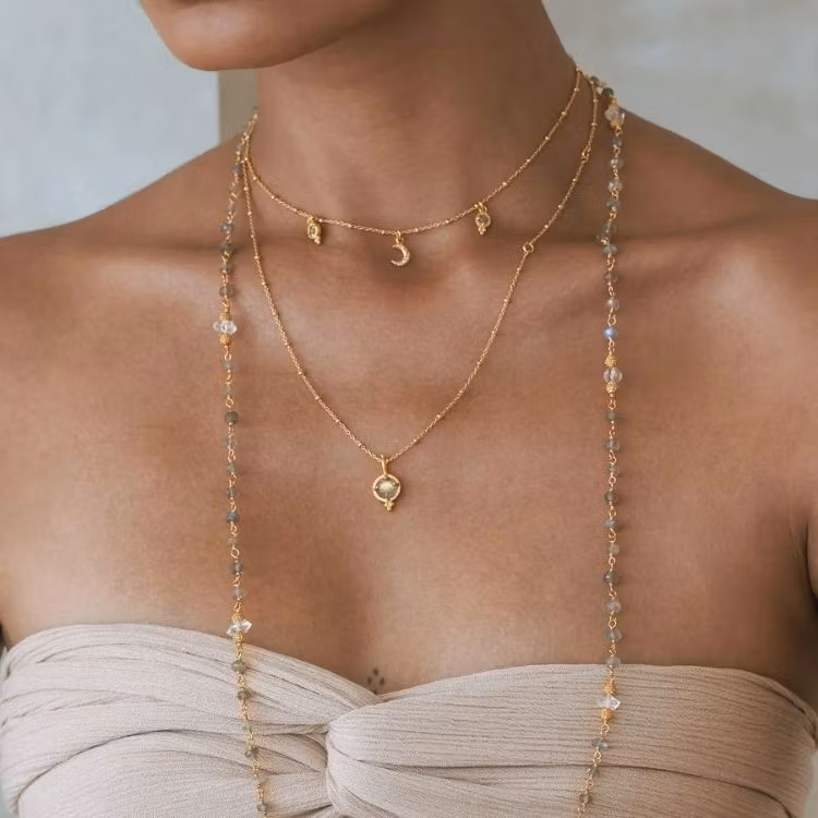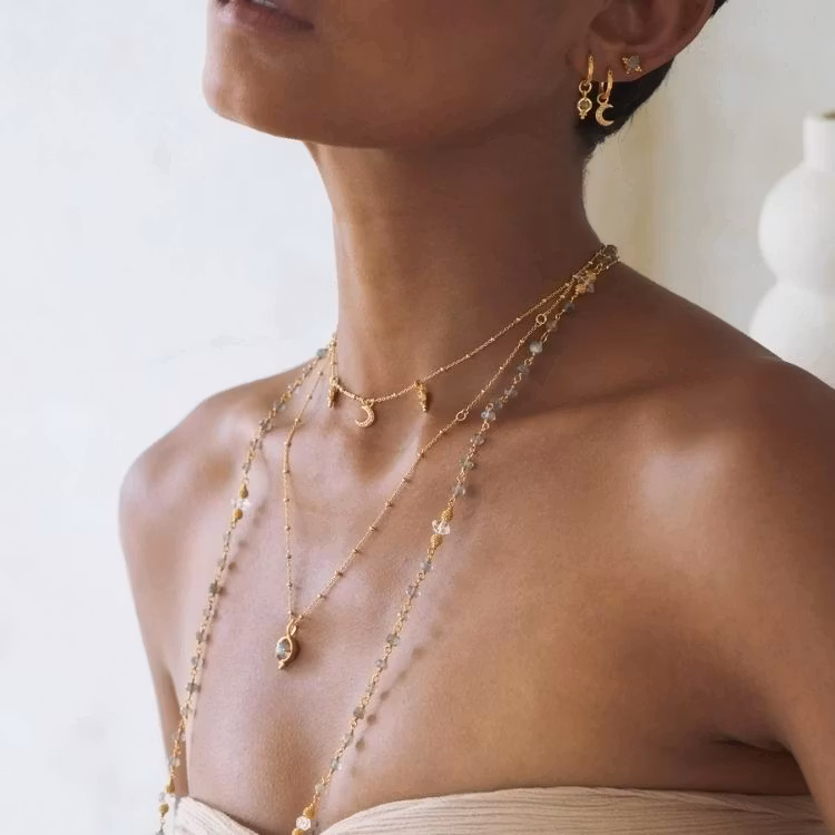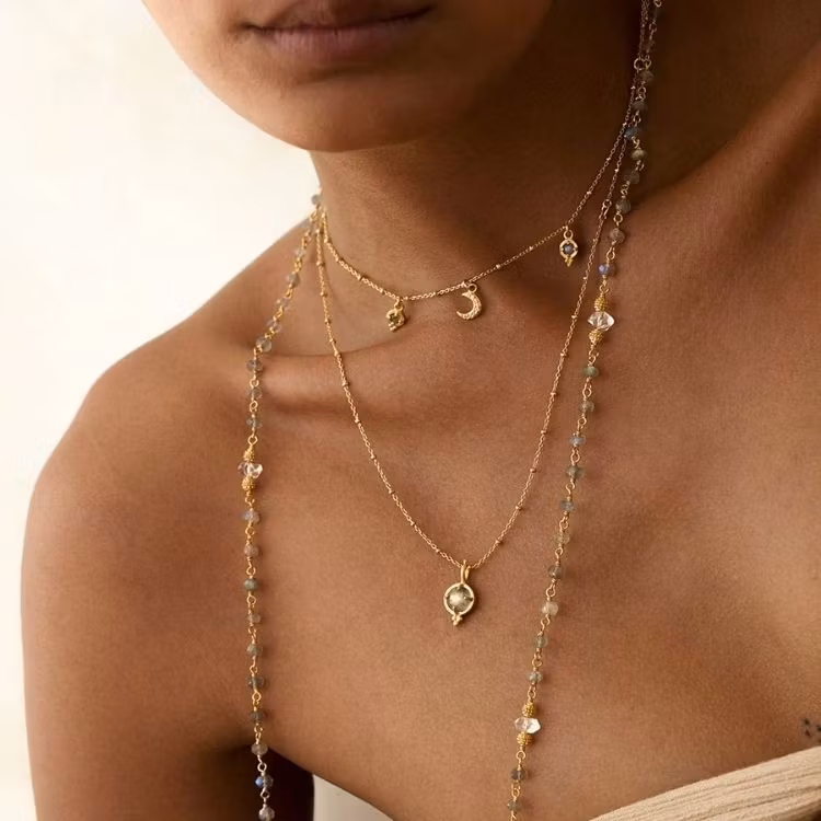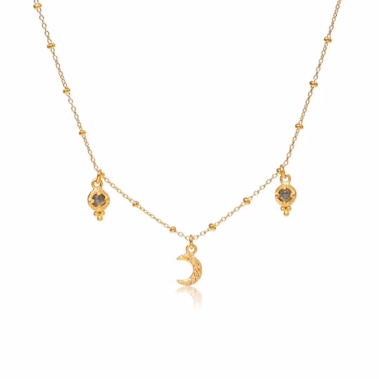 Ananda Soul´s Dreamseed-halsband bär en vacker halvmåne prydd med månstenar, tillsammans med två "frön" gjorda av labradorit. Labradorit är en sten förknippad med magi, transformation och förändring. Denna design är kopplad till nymånen.