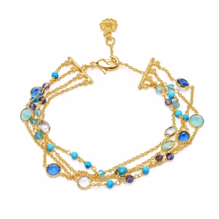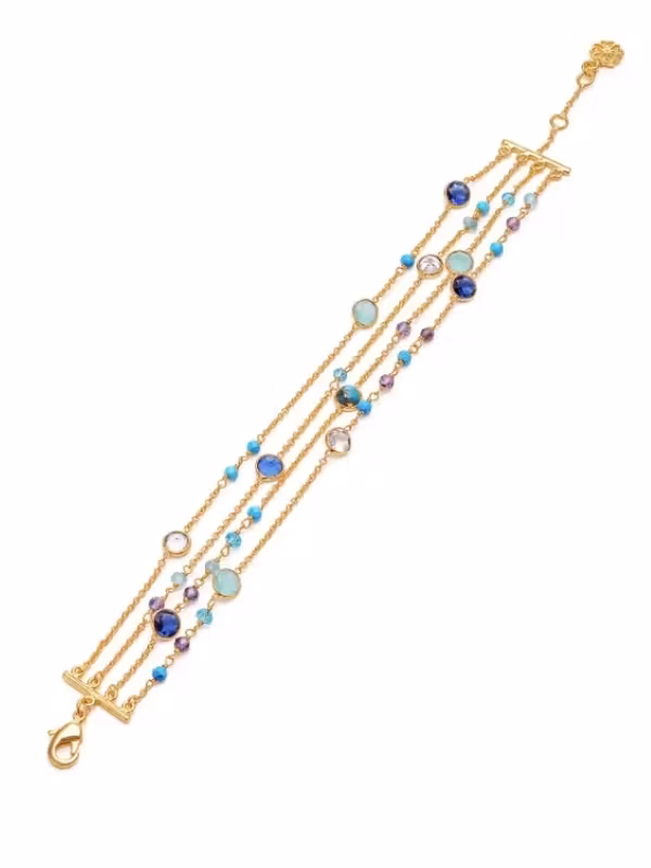 Armbandet är handgjort av skickliga artisaner i 22 karats guldpläterad återvunnen mässing, smyckat med glittrande nyanser av iolite, blå topas och apatit.