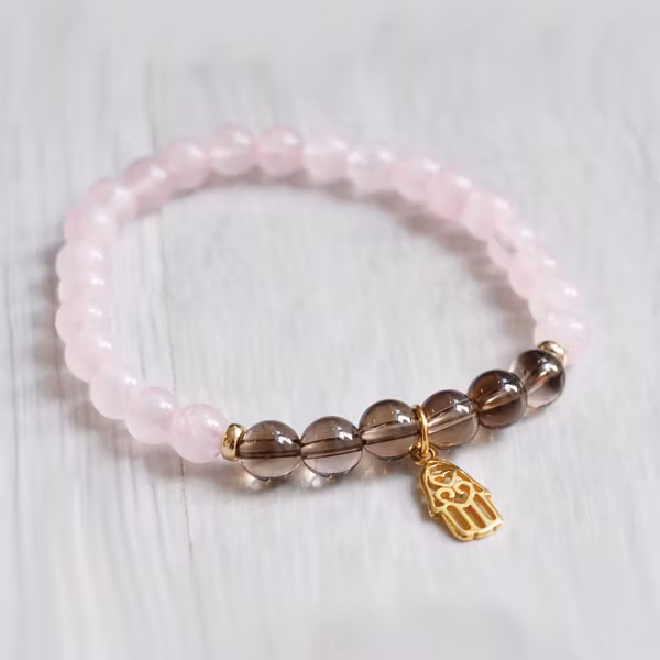 Armband av Rosenkvarts och Rökkvarts. Vacker liten berlock av fatimashand.