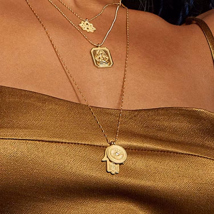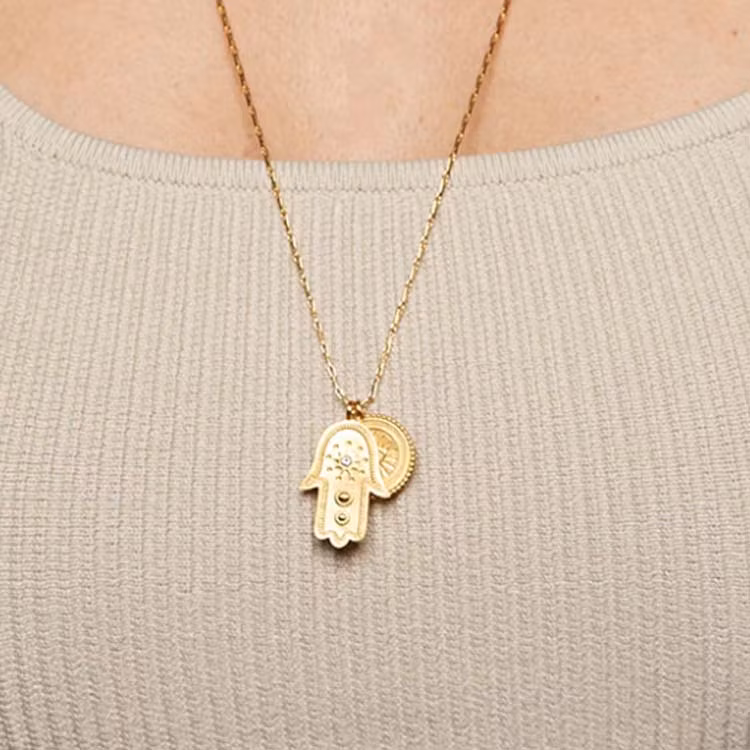 Magiskt halsband från Satya i förgylld mässing med ett hänge föreställande Hamsas hand som står för välsignelse och skydd. Bredvid Hamsas hand "The Evil Eye" (Onda ögat) som står för skydd, intuition och upplysning "Låt din ande vara lätt på din väg till sanning, för du är skyddad mot negativitet och skada"
