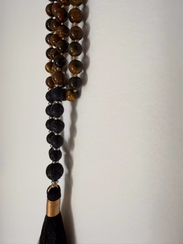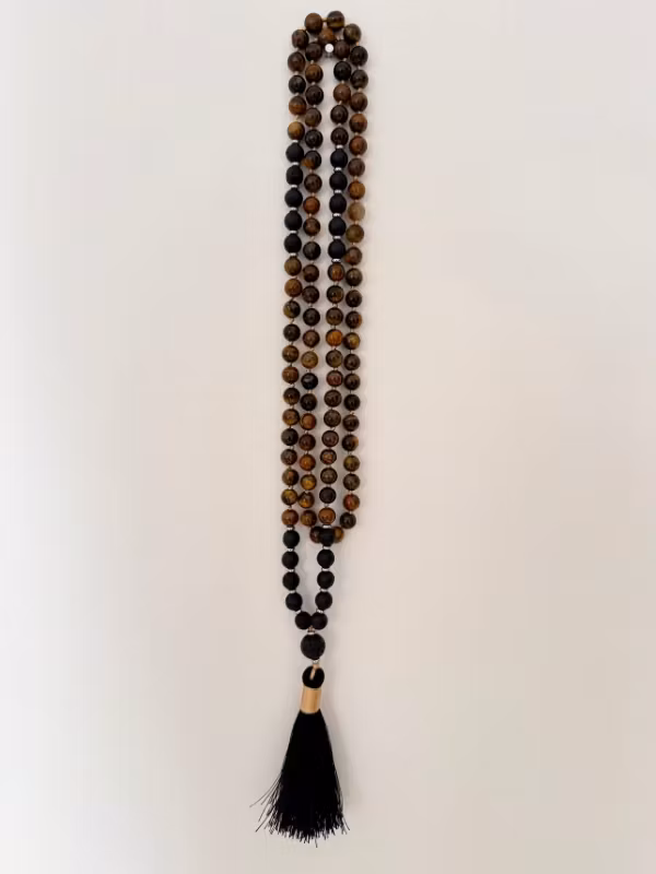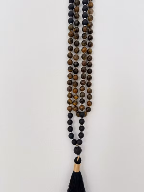 Detta kraftfulla mala-halsband är skapat av tigeröga och lavasten, två stenar som tillsammans förmedlar styrka, klarhet och jordande energi. Med 108 naturliga stenar, en gurupärla i lavasten, en svart silkestofs och silvriga mellandelar förenar halsbandet både elegans och kraftfull symbolik.