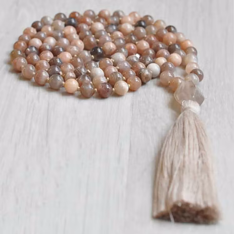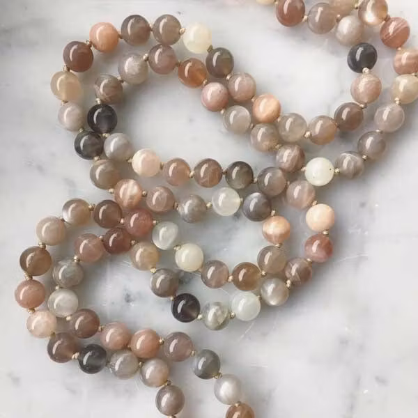 Handknuten Mala av vacker Månsten. Månstenen har länge betraktats som en symbol för kvinnlig energi och fruktbarhet, och den sägs ha en lugnande och balanserande effekt på känslor och kroppsliga förändringar. Den associeras ofta med intuition och den inre visdomen, och många använder månsten i meditation för att öppna upp sitt tredje öga och stärka sin spirituella anknytning. Precis som månen lyser upp natten, reflekterar månstenen det omgivande ljuset i en förtrollande skimmer.