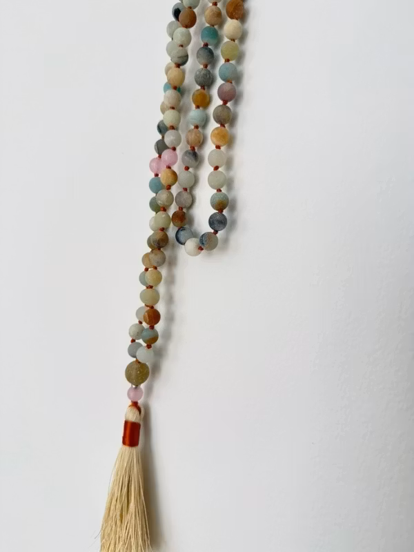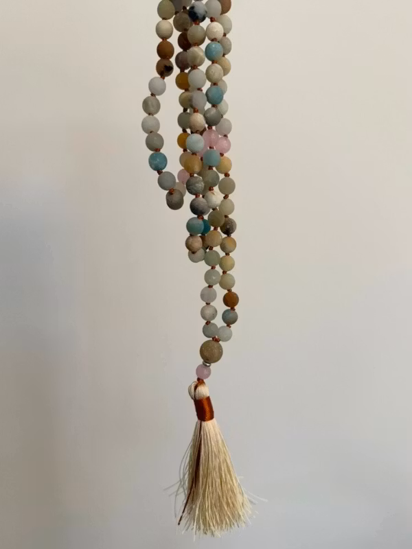 Ett mala-halsband är mer än bara ett smycke – det är ett redskap för stillhet, närvaro och en påminnelse om din inre kraft. Detta vackra mala är skapat med 108 matta, naturliga stenar i frostad rosenkvarts och amazonit, två kristaller som tillsammans väcker hjärtats energi, ger ro och öppnar upp för självkärlek.