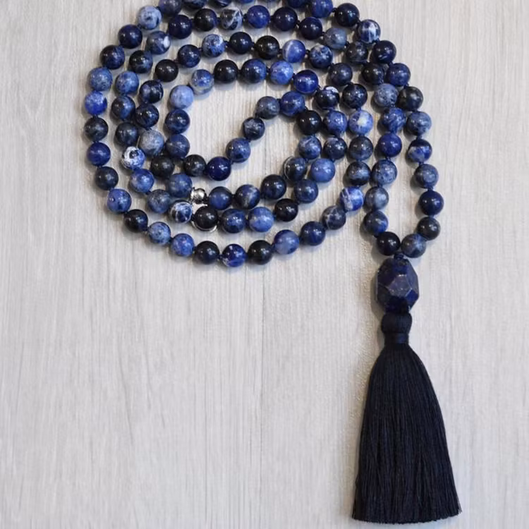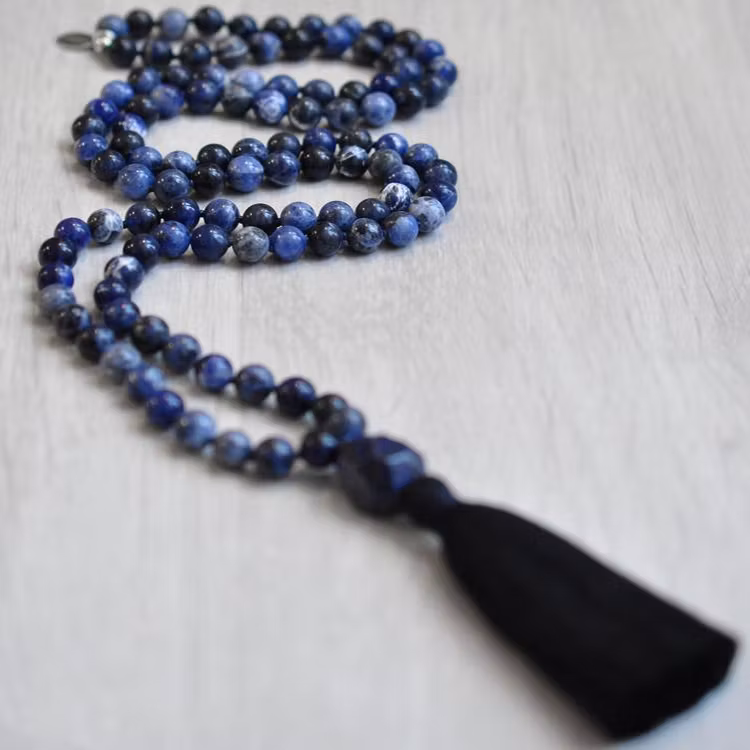 Handknuten Mala av den otroliga stenen Sodalit. Sodalit är en kraftfull ädelsten som främjar kreativt tänkande och kunskap i alla former. Den stärker banden mellan människor och uppmuntrar vänskap, solidaritet och gemenskap. Sodaliten stärker även självkänsla, ökar tillit och balanserar oberoende med social interaktion. Med sin förmåga att öka intuition och närvaro är den en värdefull följeslagare för meditation och andlig utveckling. Sodaliten är en mångsidig ädelsten som berikar olika aspekter av våra liv och medvetenhetsnivåer.