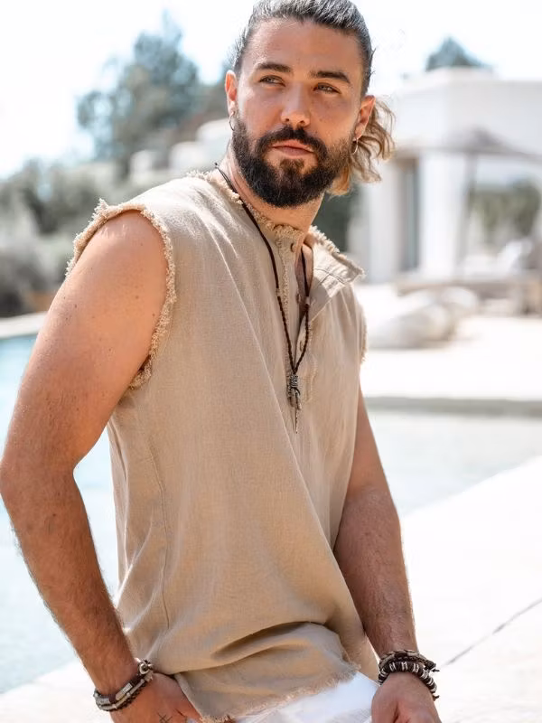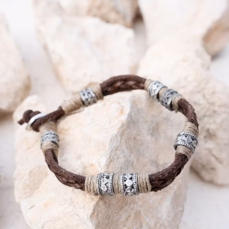 Ett unisex armband med karaktär och tidlös stil. Armbandet Angka i brunt är tillverkat i en robust mix av läder, zink och jute, vilket ger en rå och naturlig känsla. Ge din outfit lite extra personlighet.