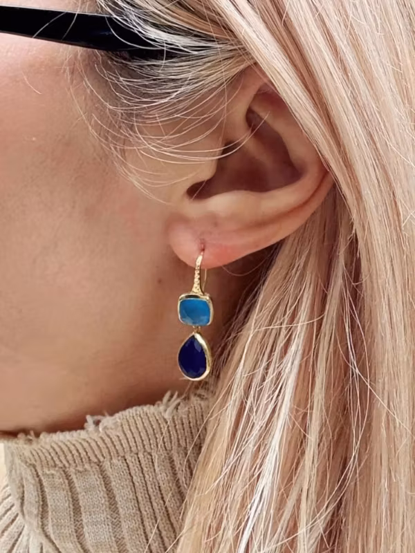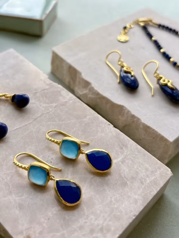 Azuni Charis örhängen är omsorgsfullt skapade av skickliga hantverkare i 22 karats guldpläterad återvunnen mässing, med två vackra ädelstenar: blå kalcedon och blå jade. Kombinationen av de mjuka blå tonerna och det gyllene metallet skapar ett harmoniskt uttryck som passar både till vardag och fest.