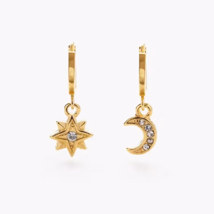 Guldiga örringar med vackra berlocker, en måne och en sol. Dessa örhängen har en vacker vintageyta och fina detaljer, som får en spirituell och bohemisk känsla. Glittrande kristaller gör att dessa örhänge ser riktigt yxiga ut. Designat och satt samman av Amana Studio i Kalifornien, USA.
