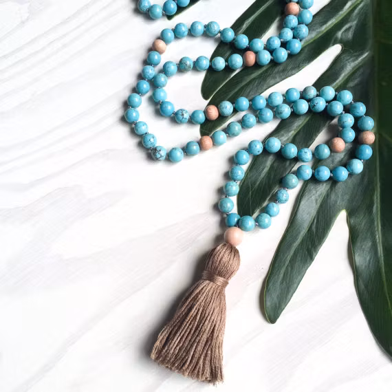 Reflect yogahalsband är handknutet med magnesit-ädelsten och rosenträ, har en gurupärla i rosenträ och en bomullstofs .