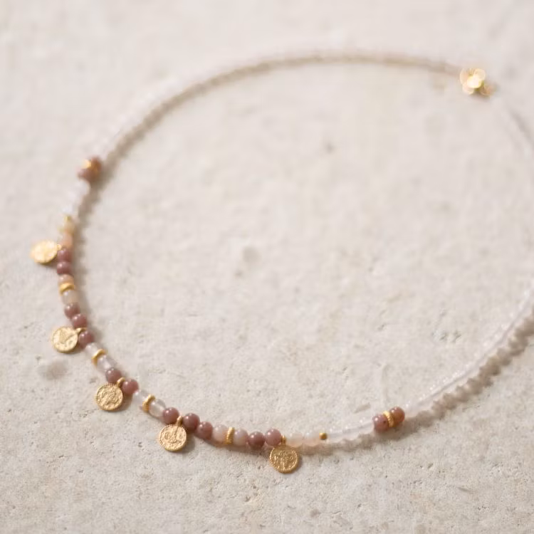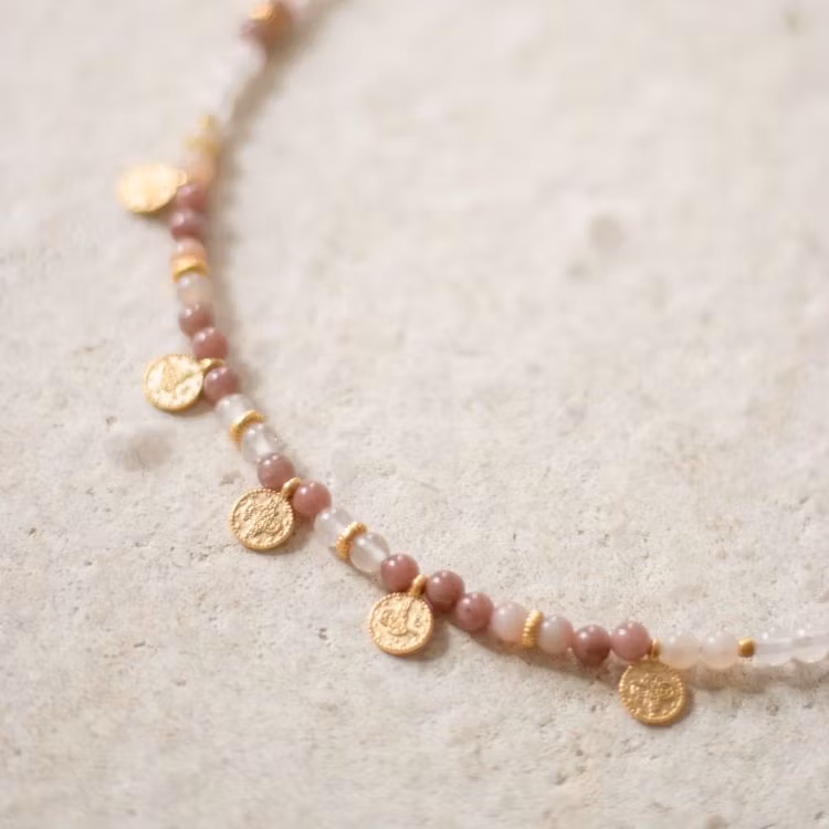 - Halsband: Rosenkvarts, rosa Aventurin. Detaljer i 24K matt guldplätering.
