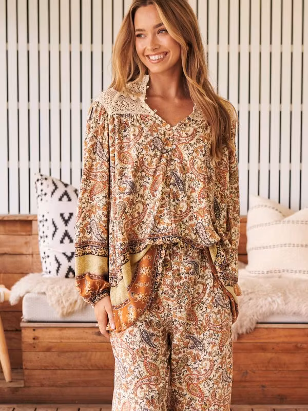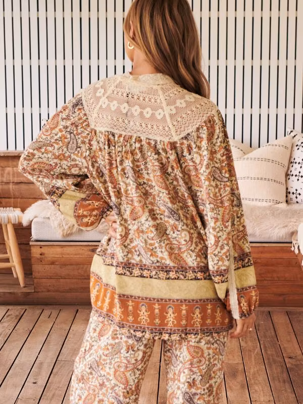Matcha denna blus med våra matchande byxor i samma mönster för en sammanhängande och trendig look som verkligen kommer att få dig att sticka ut från mängden. Eller varför inte para ihop den med ett par jeans och boots för en mer avslappnad och bohemisk stil som passar perfekt för en dag på festivalen eller en spontan utflykt i naturen?