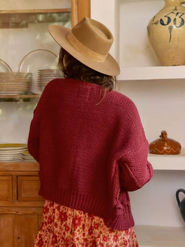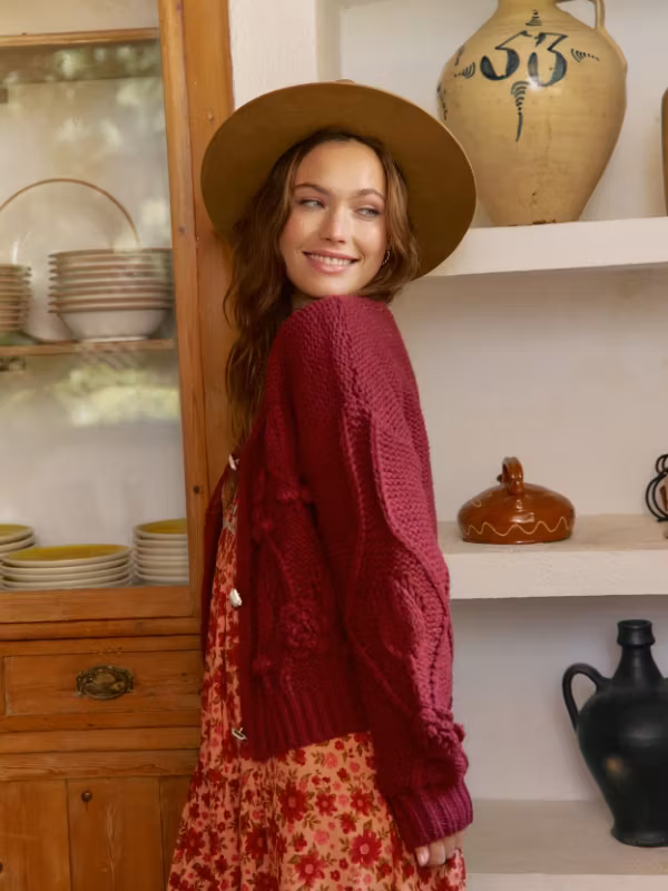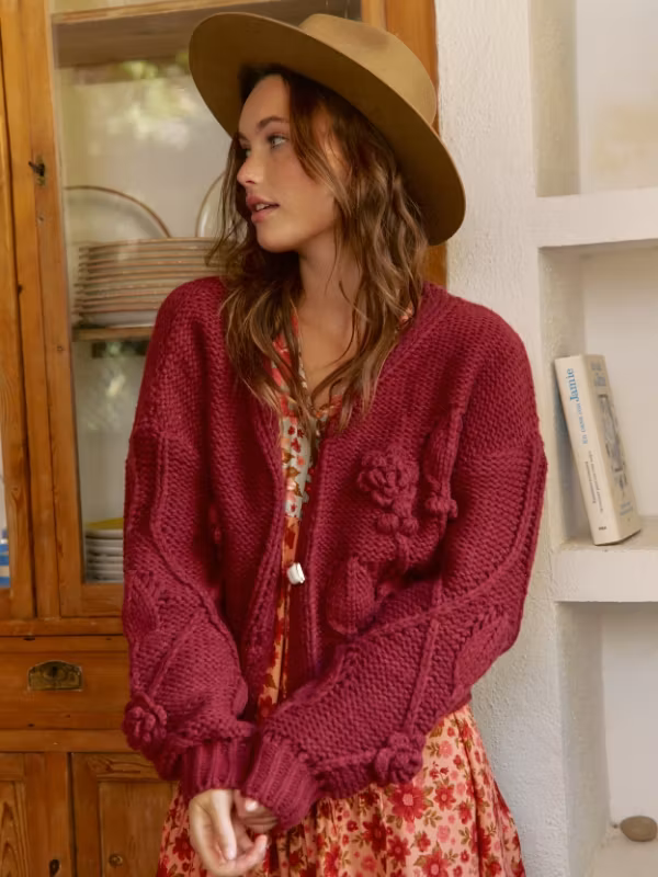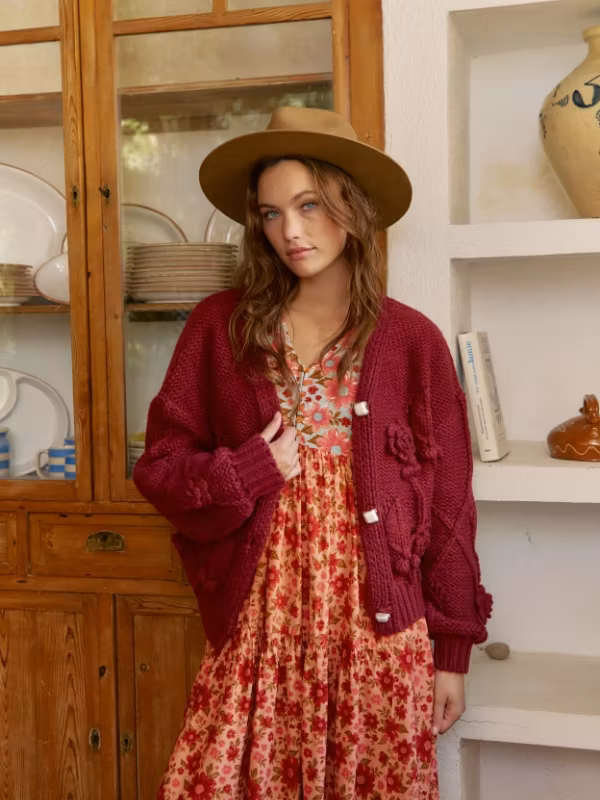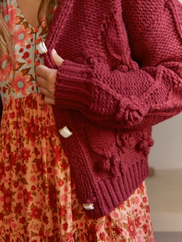 Upptäck den perfekta koftan för din bohemiska garderob! Denna tjocka, grovt stickade vinröda kofta är skapad för att ge en varm och stilfull känsla i alla looks. Med ett vackert stickat mönster framtill och tre stora dekorativa knappar får denna kofta dig att känna dig både chic och bekväm.