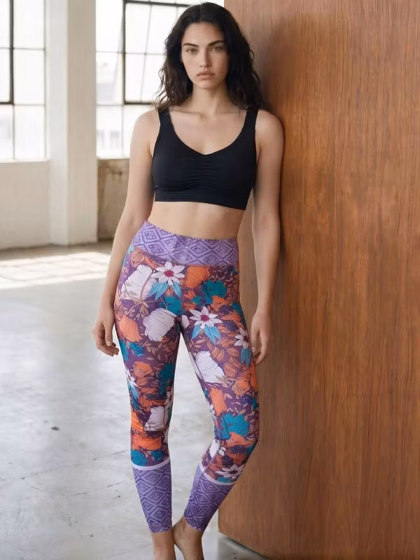 Gypset har ett bohemiskt mönster med blommor och blad i toner av lila, turkos, orange och cerise. Kanten längst ner på benen samt högst upp i midjan har ett helt annat grafiskt mönster i lila toner som bryter av och ger en läcker effekt till dina yogaleggings.