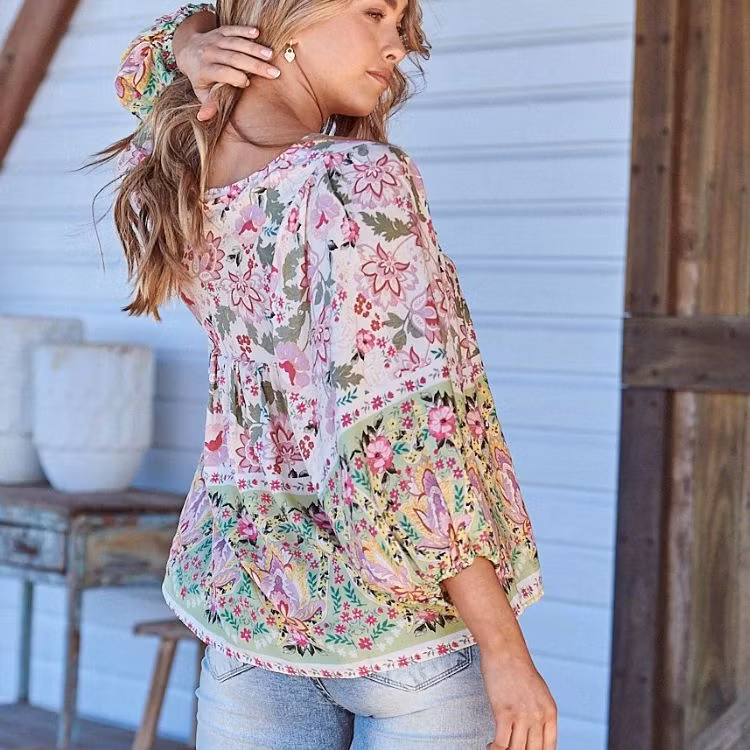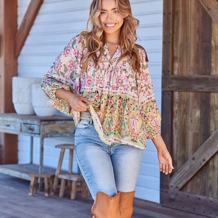 Lev ut din inre bohem med denna underbara, bohemiska blus från australienska märket Jaase. Otroligt vacker och feminin silhuett som tar fram gudinnan i dig! Denna vackra blus är V-ringad framtill med små öppningsbara knappar. Den har en lös passform med vackert, böljande ärmar och en elastisk mudd vid ärmslutet.