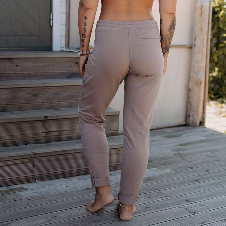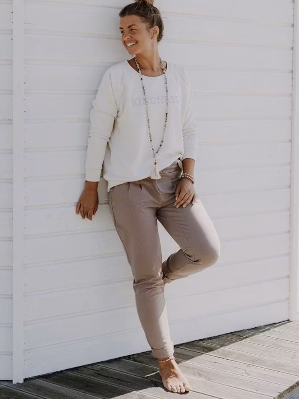 Byxan har många detaljer som ger den det lilla extra! Upptill är en mudd med dragsko, snygga sydda veck på framsidan, två praktiska sidfickor och en dold ficka i bak. Byxbenen kan vikas upp eller så kan du ha dem helt ute och få en snygg rynkad effekt nedtill. Dressa upp byxorna med en snygg topp och smycken eller använd som en riktigt snygg loungebyxa.