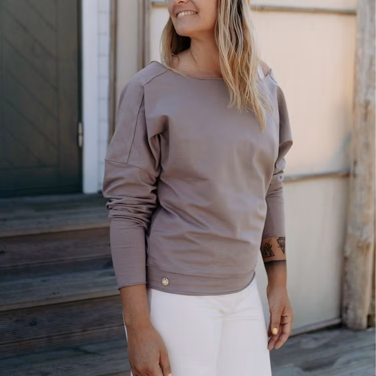 Tröjan Boat Neck kan bäras off shoulder eller uppe på axeln med en ledig, snygg urringning. Skön att mysa i och snygg att bära till vardags med ett par jeans.