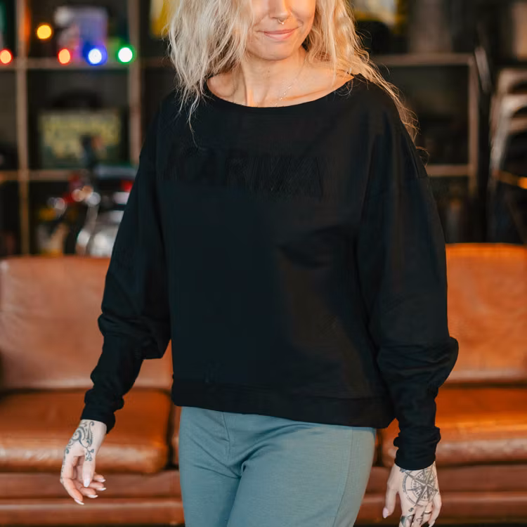 Sweater Puff Karma är en urskön, svart tröja med unika detaljer som är tillverkad i härlig GOTS-certifierad bomull. På bröstet står texten KARMA som är påsytt ton-i-ton med tröjan. De extra långa muddarna gör att tröjans ärm får en snygg liten puff längst ner, därav tröjans namn.
