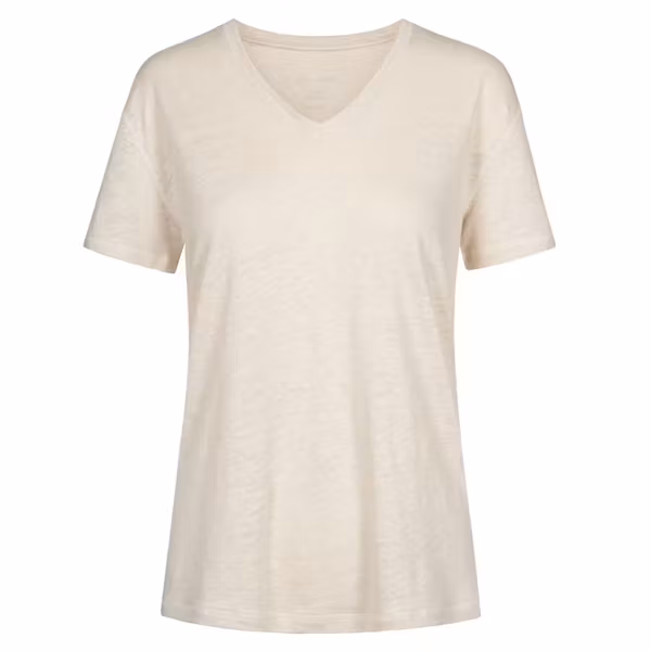 Snygg kort tröja i modellen Sif, här i den vackra färgen Moonstruck. Sif är en v-ringad t-shirt som är Oeko-Tex® märkt och tillverkat i 100% linne, ett helt naturligt material som gör att din hud kan andas.