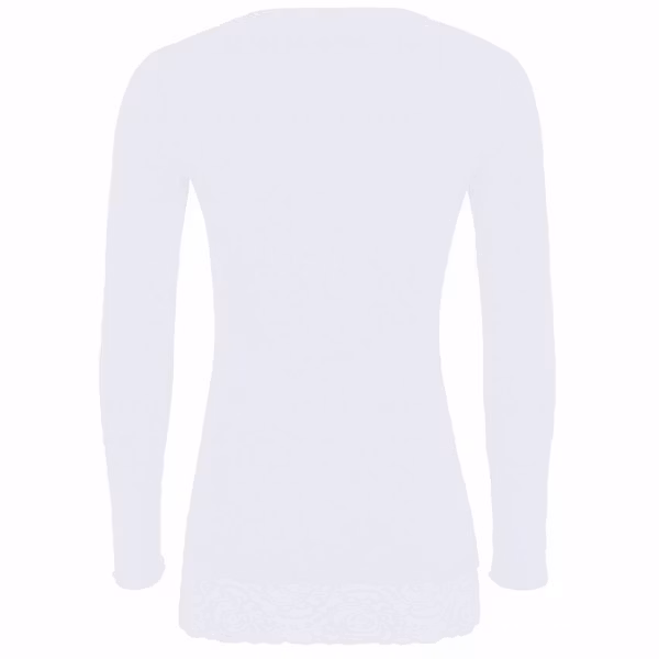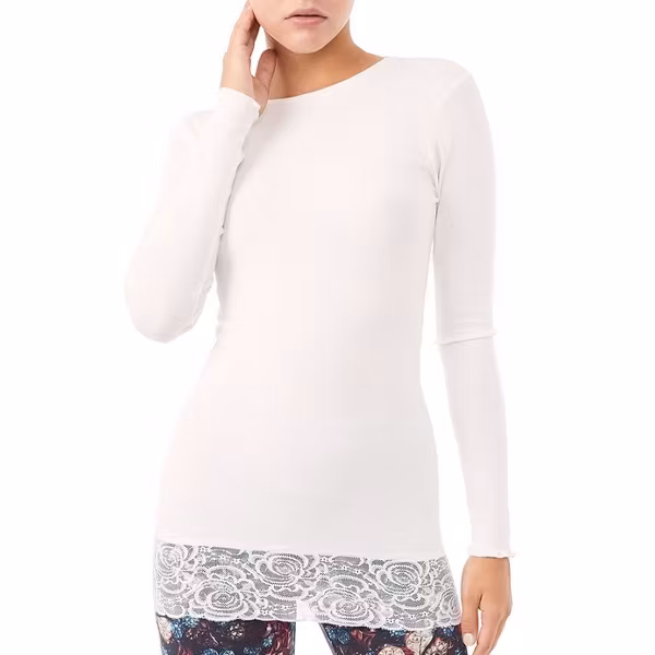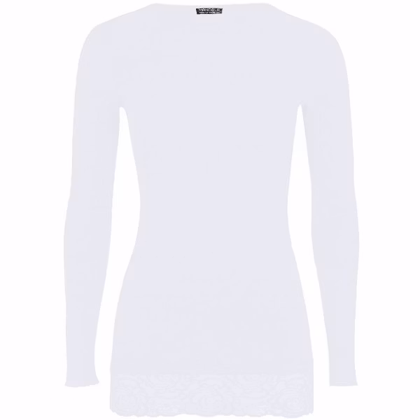 En snygg vit lång tröja med spetskant nertill ifrån Mandala. Lite mer åt det cremé färgade hållet. Använd den till vardags under en tjockare tröja så att man ser spetsen nertill. En tröja som är riktigt mjuk och skön, passar vid flera olika tillfällen.