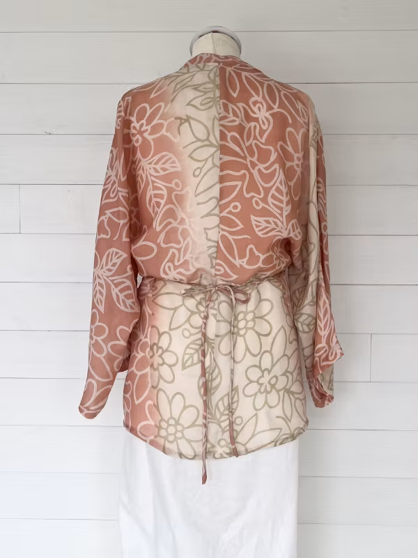 Denna kimono är tillverkad av återvunna sari som Indiska kvinnor har burit med stolthet. Vi älskar tanken att återanvända vackra tyger "slow fashion" när den är som bäst.