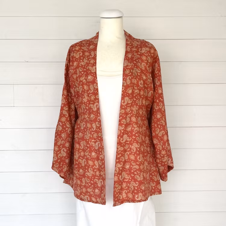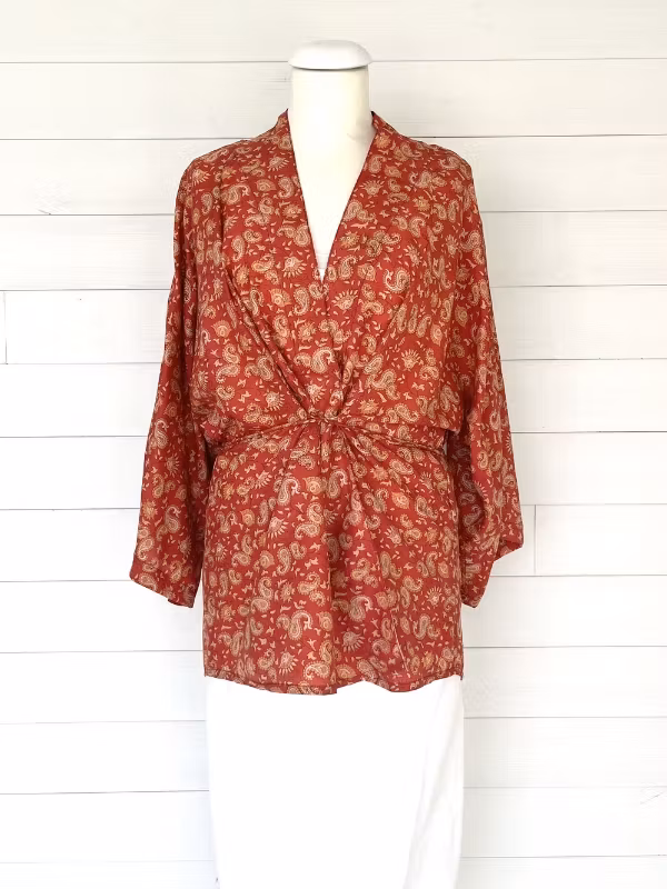 Denna kimono är tillverkad av återvunna sari som Indiska kvinnor har burit med stolthet. Vi älskar tanken att återanvända vackra tyger "slow fashion" när den är som bäst.