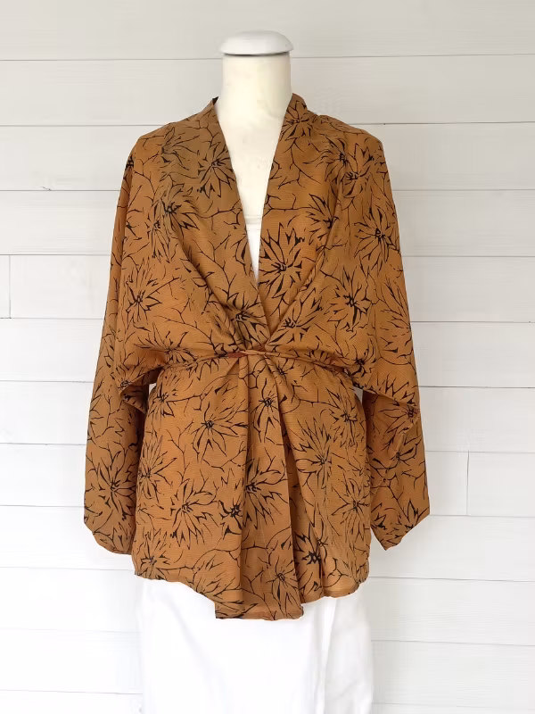 Denna kimono är tillverkad av återvunna sari som Indiska kvinnor har burit med stolthet. Vi älskar tanken att återanvända vackra tyger "slow fashion" när den är som bäst.