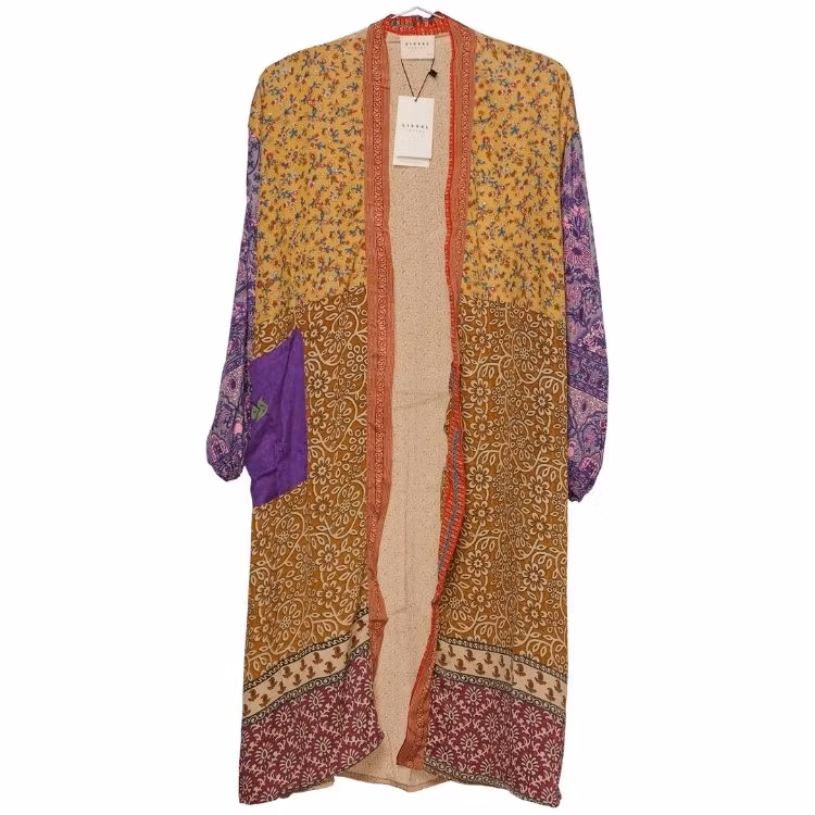 Denna kimono är tillverkad av återvunna sari som Indiska kvinnor har burit med stolthet. Vi älskar tanken att återanvända vackra tyger "slow fashion" när den är som bäst. Samtliga tyger är tvättade före man har sytt om dom till trendiga kimonos. Därför kan man också se spår av att plaggets tyg har blivit använt sen tidigare.