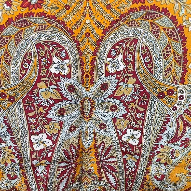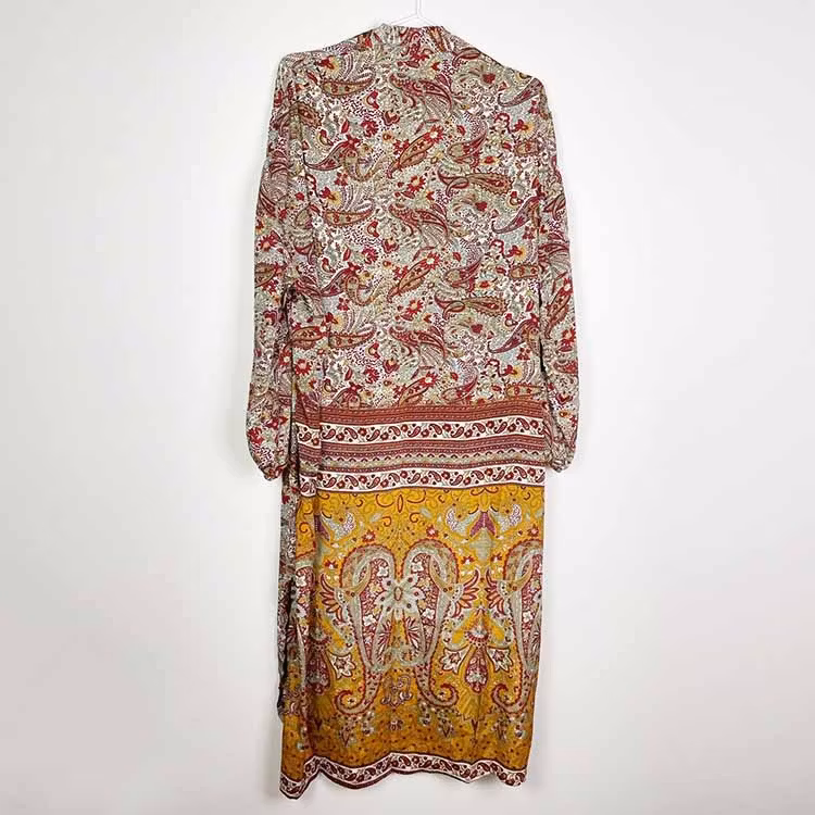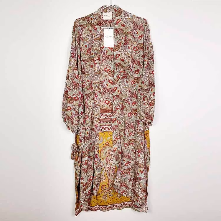 Denna kimono är tillverkad av återvunna sari som Indiska kvinnor har burit med stolthet. Vi älskar tanken att återanvända vackra tyger "slow fashion" när den är som bäst. Samtliga tyger är tvättade före man har sytt om dom till trendiga kimonos. Därför kan man också se spår av att plaggets tyg har blivit använt sen tidigare.