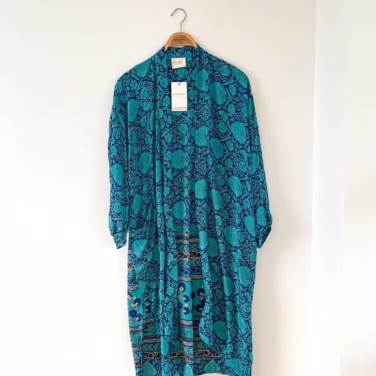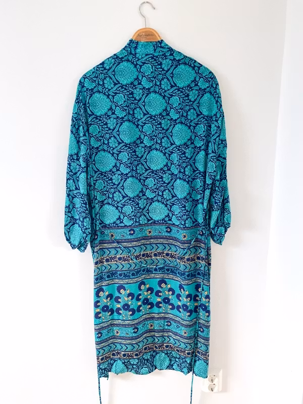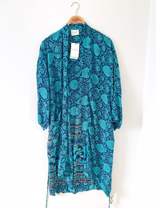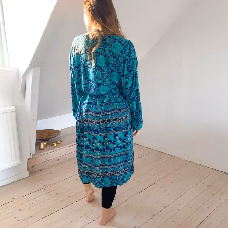 Denna kimono är tillverkad av återvunna sari som Indiska kvinnor har burit med stolthet. Vi älskar tanken att återanvända vackra tyger "slow fashion" när den är som bäst. Samtliga tyger är tvättade före man har sytt om dom till trendiga kimonos. Därför kan man också se spår av att plaggets tyg har blivit använt sen tidigare.
