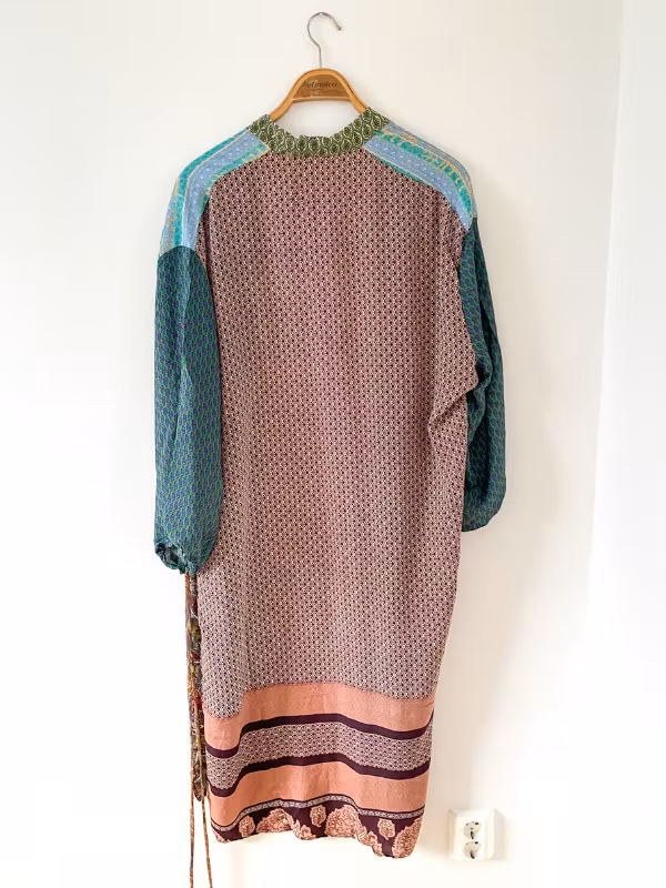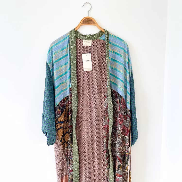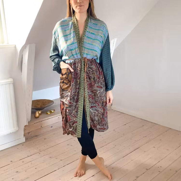 Denna kimono är tillverkad av återvunna sari som Indiska kvinnor har burit med stolthet. Vi älskar tanken att återanvända vackra tyger "slow fashion" när den är som bäst. Samtliga tyger är tvättade före man har sytt om dom till trendiga kimonos. Därför kan man också se spår av att plaggets tyg har blivit använt sen tidigare.