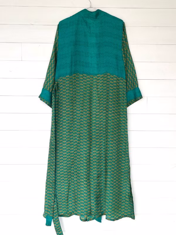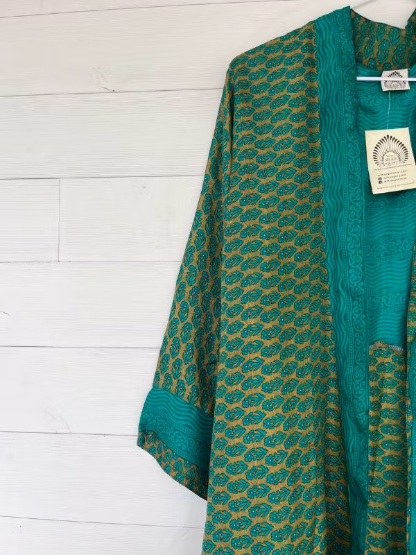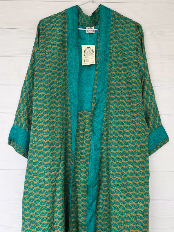 Denna kimono är tillverkad av återvunna sari som Indiska kvinnor har burit med stolthet. Vi älskar tanken att återanvända vackra tyger "slow fashion" när den är som bäst.