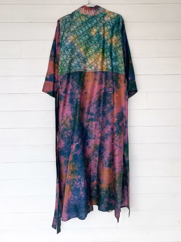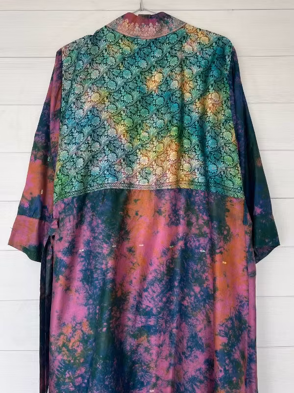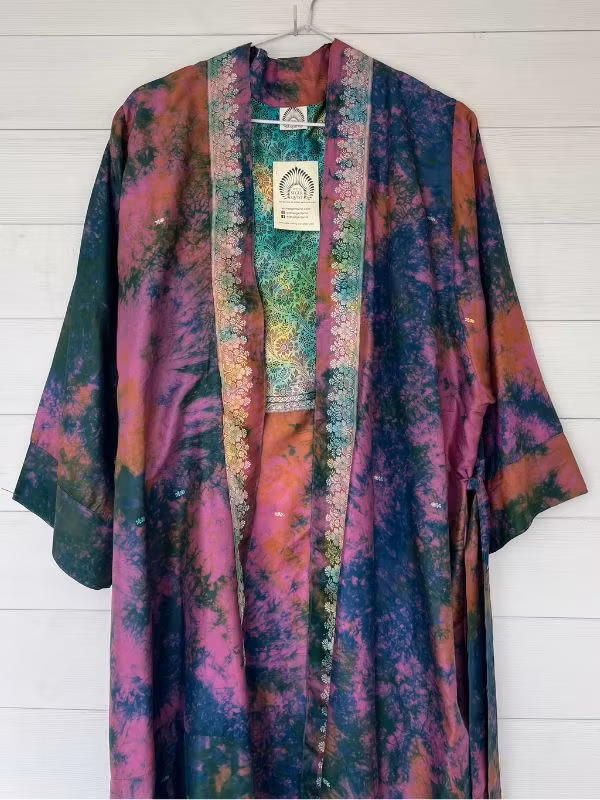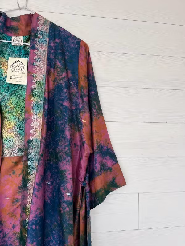 Denna kimono är tillverkad av återvunna sari som Indiska kvinnor har burit med stolthet. Vi älskar tanken att återanvända vackra tyger "slow fashion" när den är som bäst.