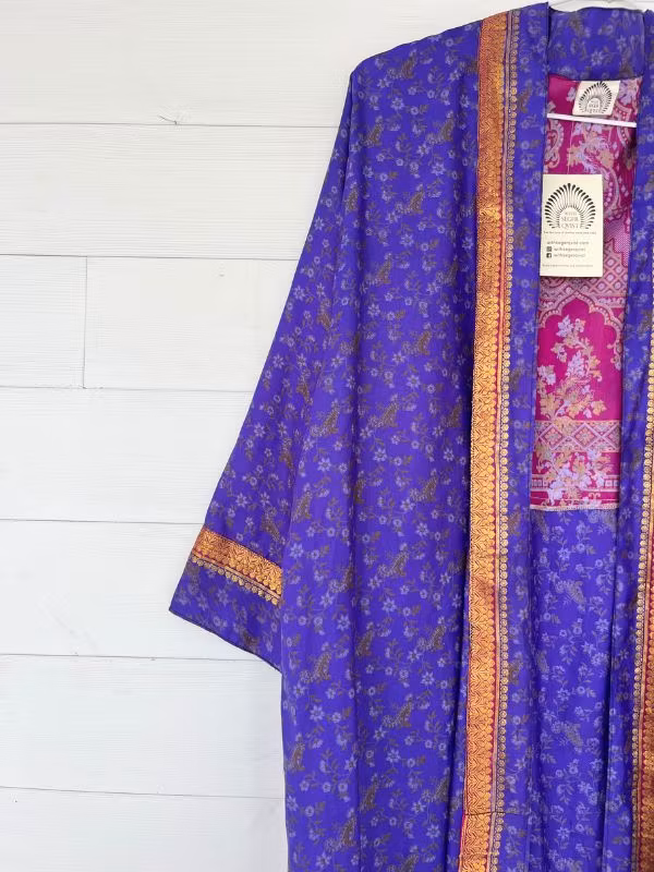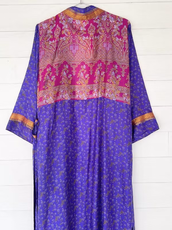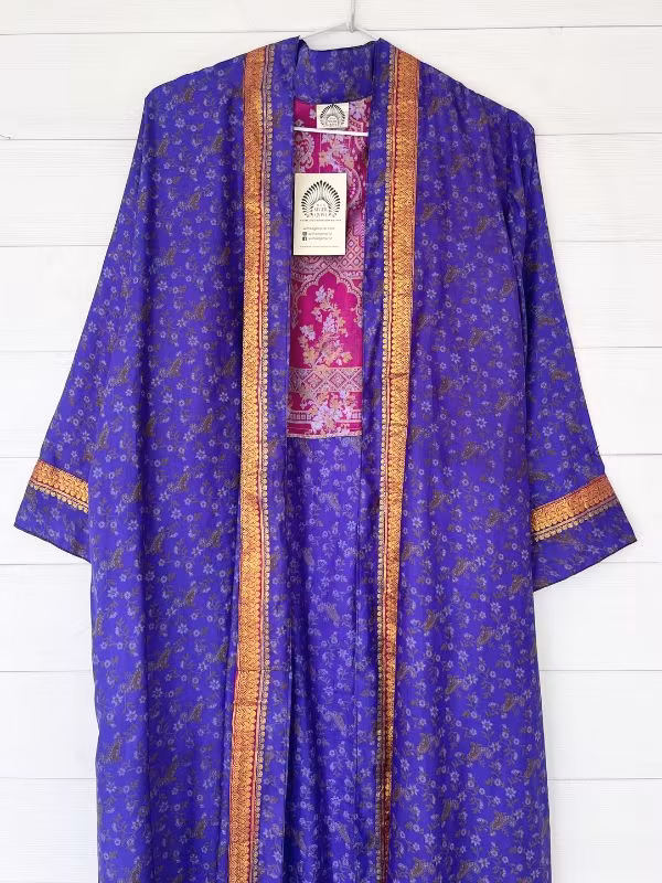Denna kimono är tillverkad av återvunna sari som Indiska kvinnor har burit med stolthet. Vi älskar tanken att återanvända vackra tyger "slow fashion" när den är som bäst.