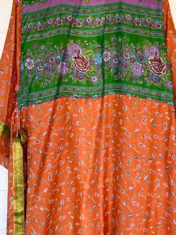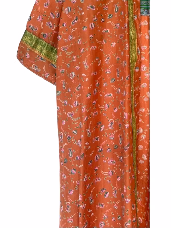 Denna kimono är tillverkad av återvunna sari som Indiska kvinnor har burit med stolthet. Vi älskar tanken att återanvända vackra tyger "slow fashion" när den är som bäst.