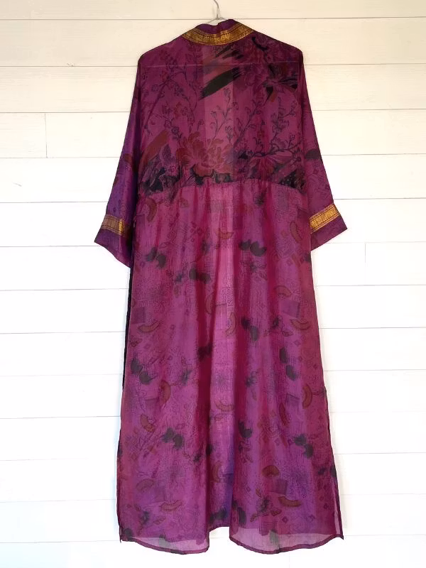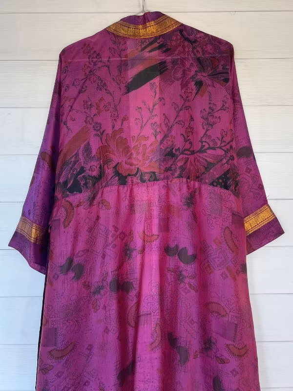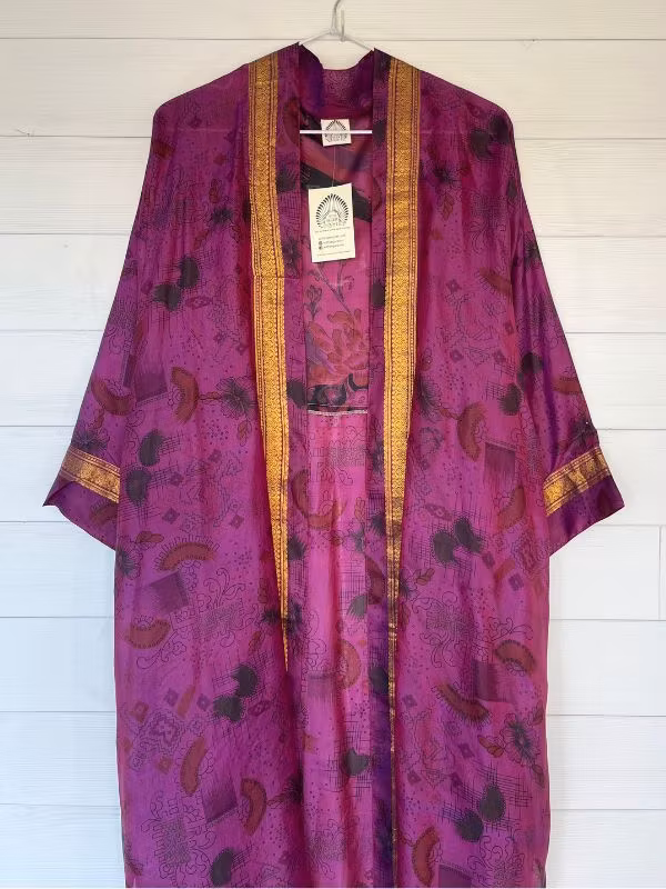 Denna kimono är tillverkad av återvunna sari som Indiska kvinnor har burit med stolthet. Vi älskar tanken att återanvända vackra tyger "slow fashion" när den är som bäst.