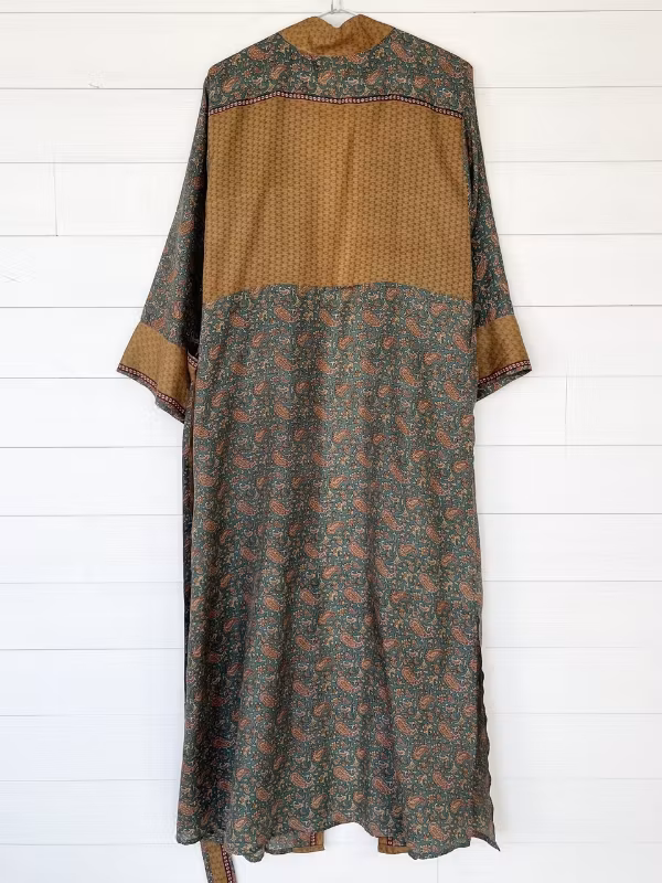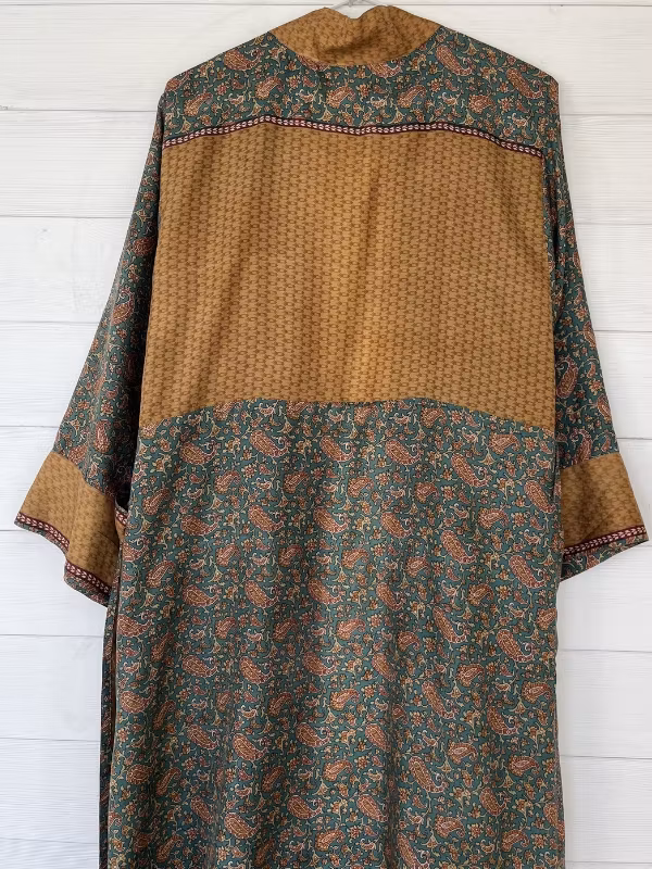 Denna kimono är tillverkad av återvunna sari som Indiska kvinnor har burit med stolthet. Vi älskar tanken att återanvända vackra tyger "slow fashion" när den är som bäst.