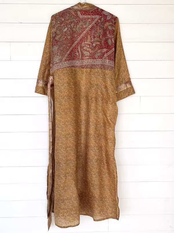 Att välja en kimono i återvunnen sari är inte bara ett stilval – det är också ett steg mot hållbart mode och slow fashion. Genom att återbruka textilier förlängs livscykeln för vackra tyger och varje plagg får nytt liv.