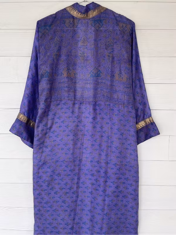 Denna kimono är tillverkad av återvunna sari som Indiska kvinnor har burit med stolthet. Vi älskar tanken att återanvända vackra tyger "slow fashion" när den är som bäst.