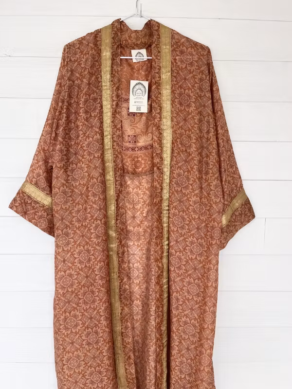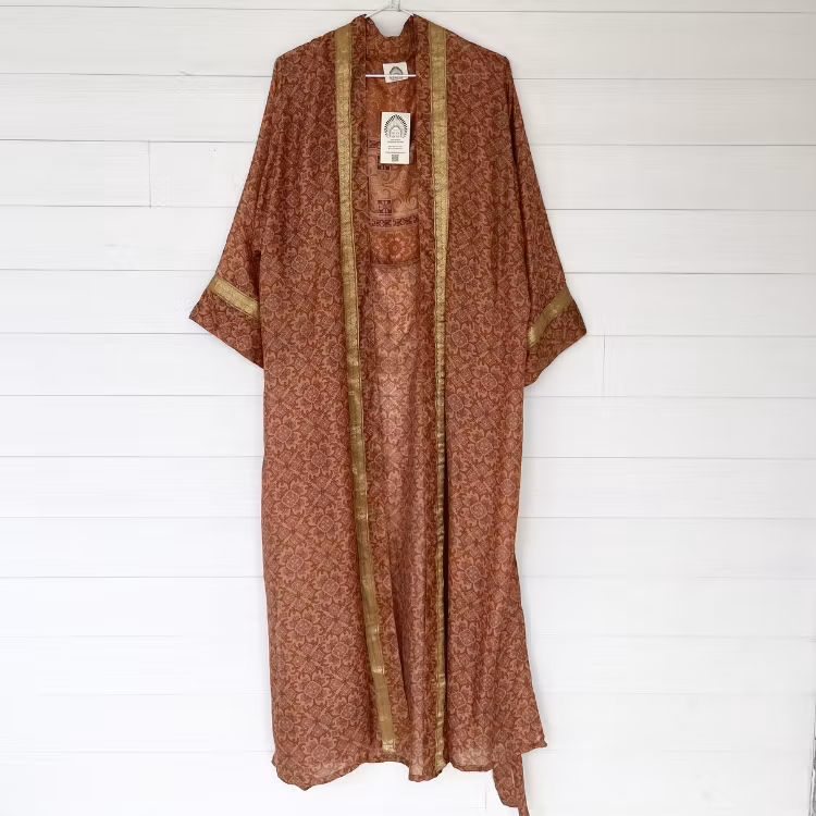 Att välja en kimono i återvunnen sari är inte bara ett stilval – det är också ett steg mot hållbart mode och slow fashion. Genom att återbruka textilier förlängs livscykeln för vackra tyger och varje plagg får nytt liv.